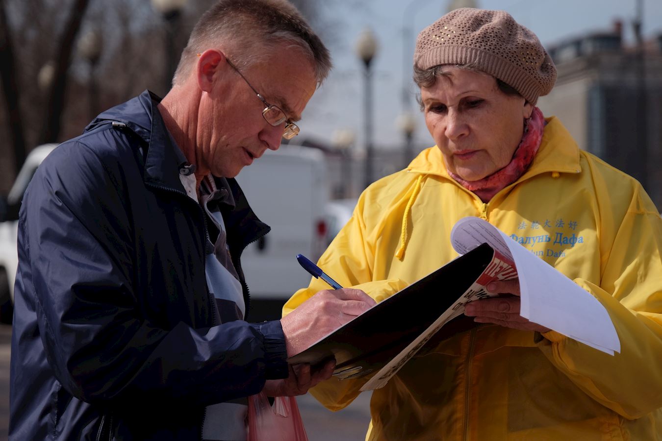 同一天,法轮大法学员在克拉斯诺雅尔斯克市中心红场举行了合法聚会,市政府开始时没有同意在这个地方举行聚会,经过法轮大法学员讲解迫害真相后,不仅批准了聚会并且在停止迫害请愿书上都签了名。