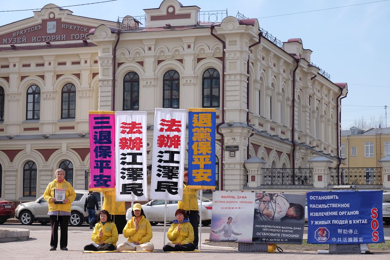 四月二十六日,法轮大法学员在中国驻伊尔库斯克市领事馆前举行了合法聚会,学员举着要求法办迫害法轮功首恶江泽民的展板,同时呼吁所有中国公民退出这个系统迫害无辜中国人的共产恶党。