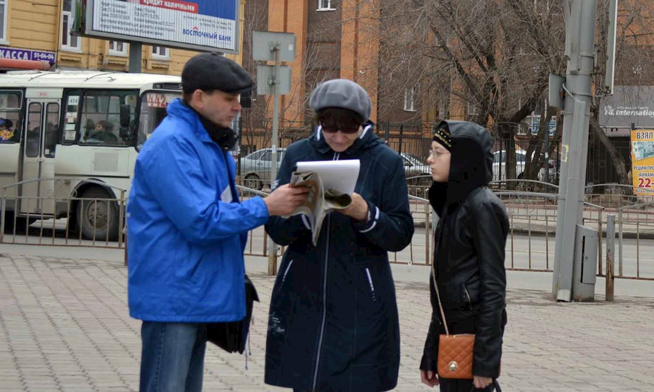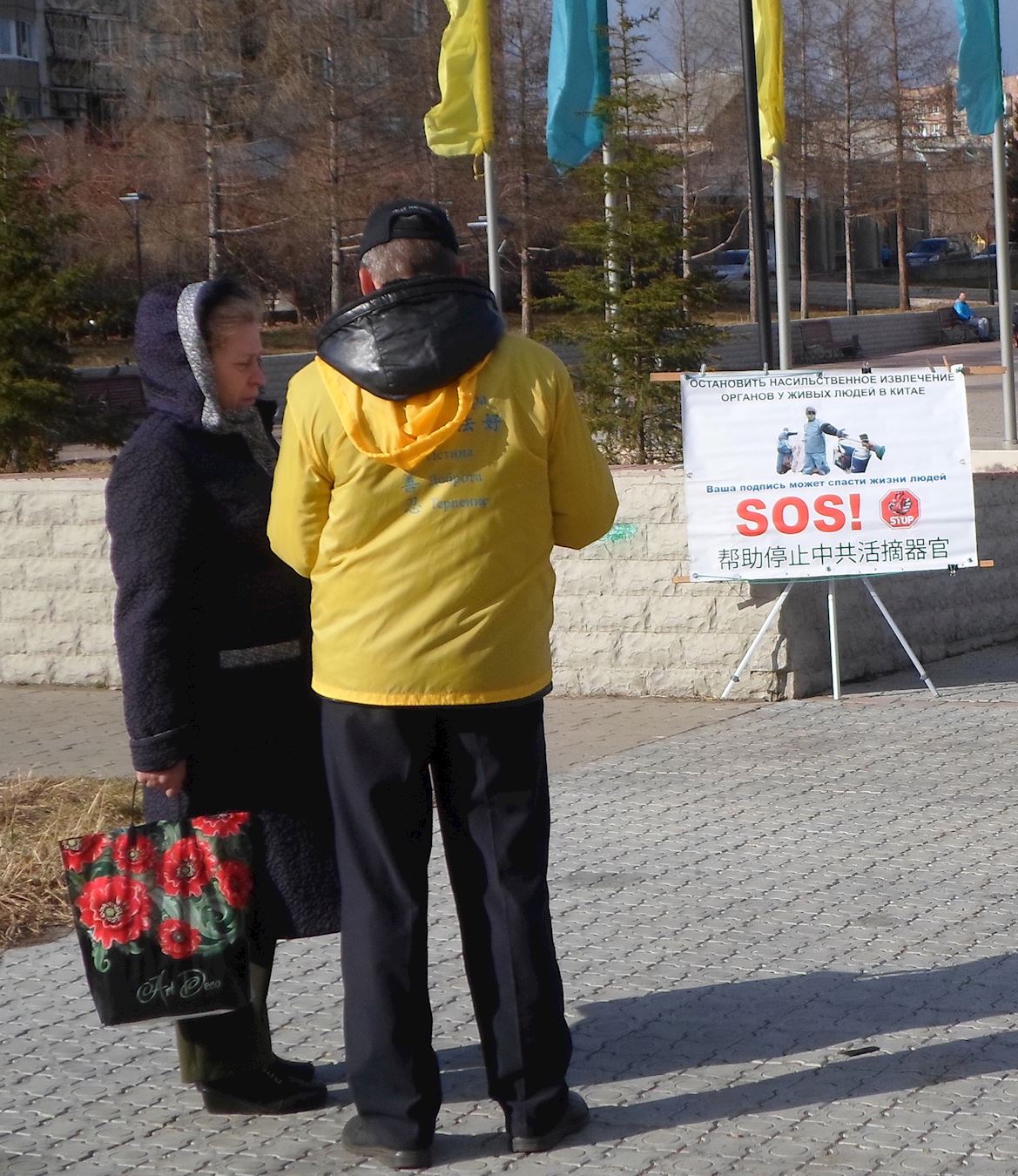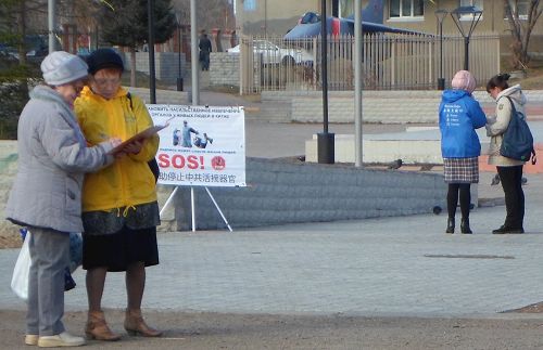 四月二十一日,法轮大法学员在乌兰乌德市中心大街举行了集会,虽然刮着冷风,但是过往行人仍然驻足宣传板前了解真相并且在停止迫害请愿书上都签了名。