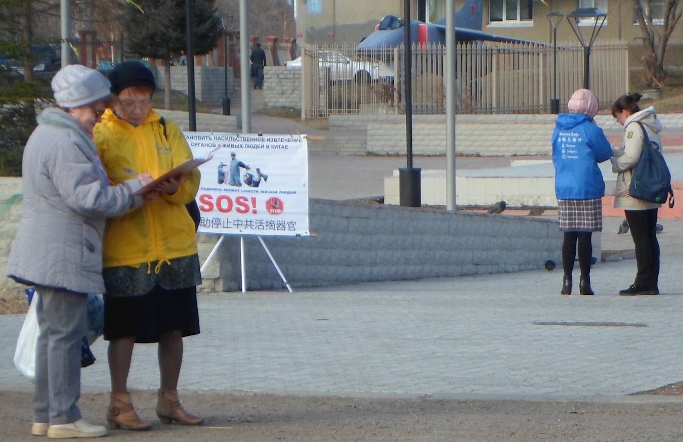 四月二十二日,海参崴法轮大法学员在体育大道举行了集会,人们了解了活摘器官情况后,纷纷在递交联合国请愿书上签字。