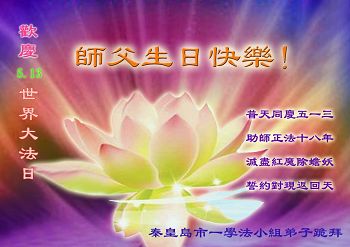 中国大陆各行各业的大法弟子借明慧网向慈悲伟大的师父问候生日快乐!欢庆法轮大法日!