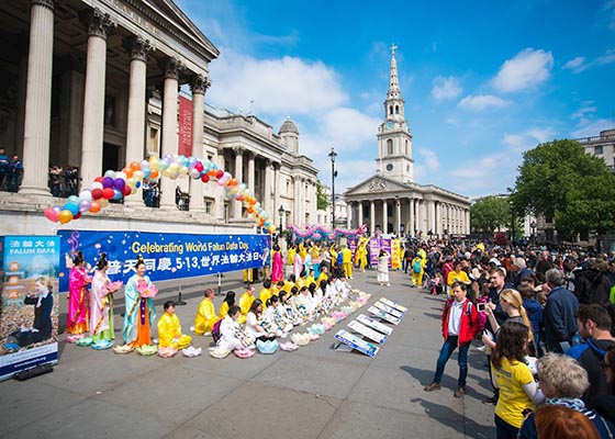 五月七日,部份英国法轮功学员相聚伦敦举行活动,欢庆法轮大法洪传世界二十五周年,恭祝李洪志先生六十六华诞。