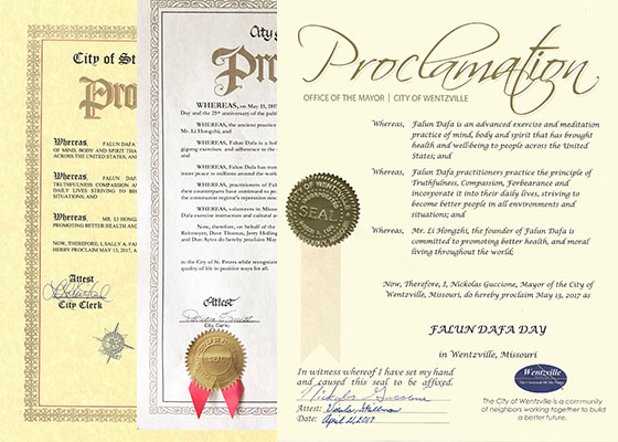 美国密苏里州圣查尔斯市、圣彼得市和温茨维尔市分别颁发褒奖,颂扬真、善、忍,并宣布二零一七年五月十三日为该市法轮大法日。
