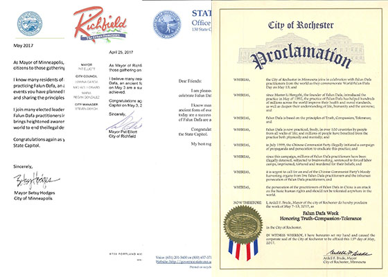 为庆祝法轮大法洪传世界二十五周年和第十八届世界法轮大法日,美国明尼苏达州州长和多个城市市长纷纷发来贺信和褒奖,表示祝贺。