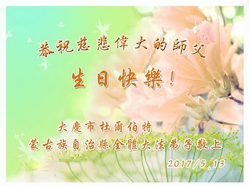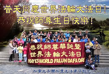 全体澳门大法弟子恭祝慈悲伟大的师尊生日快乐!普天同庆世界法轮大法日!台湾屏东地区法轮功学员恭祝师尊生日快乐!香港理工大学大法弟子恭贺世界法轮大法日暨师尊华诞!恭祝师父生日快乐!