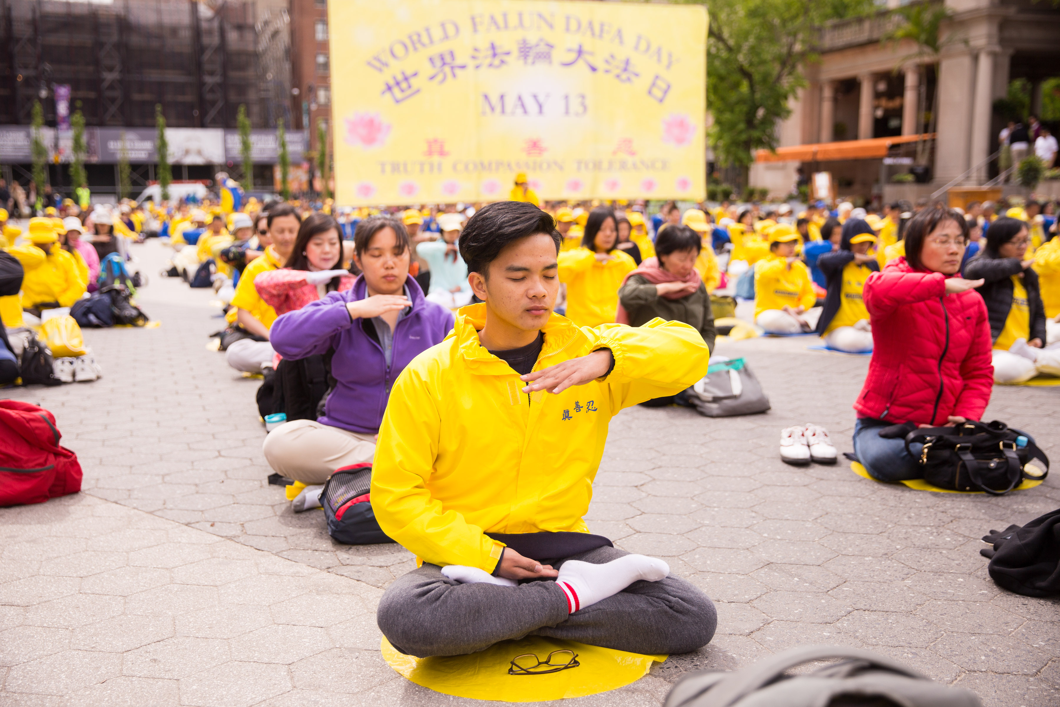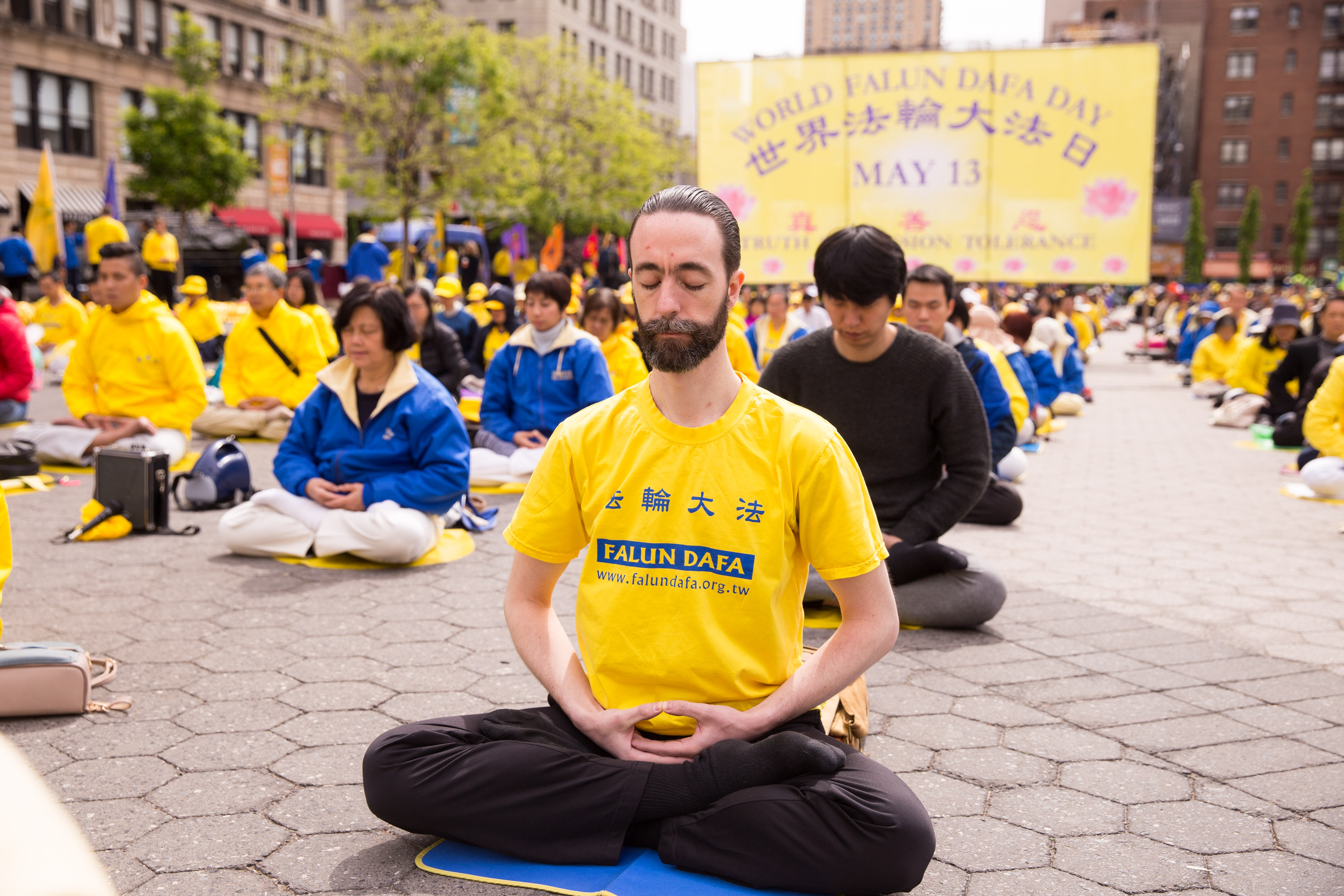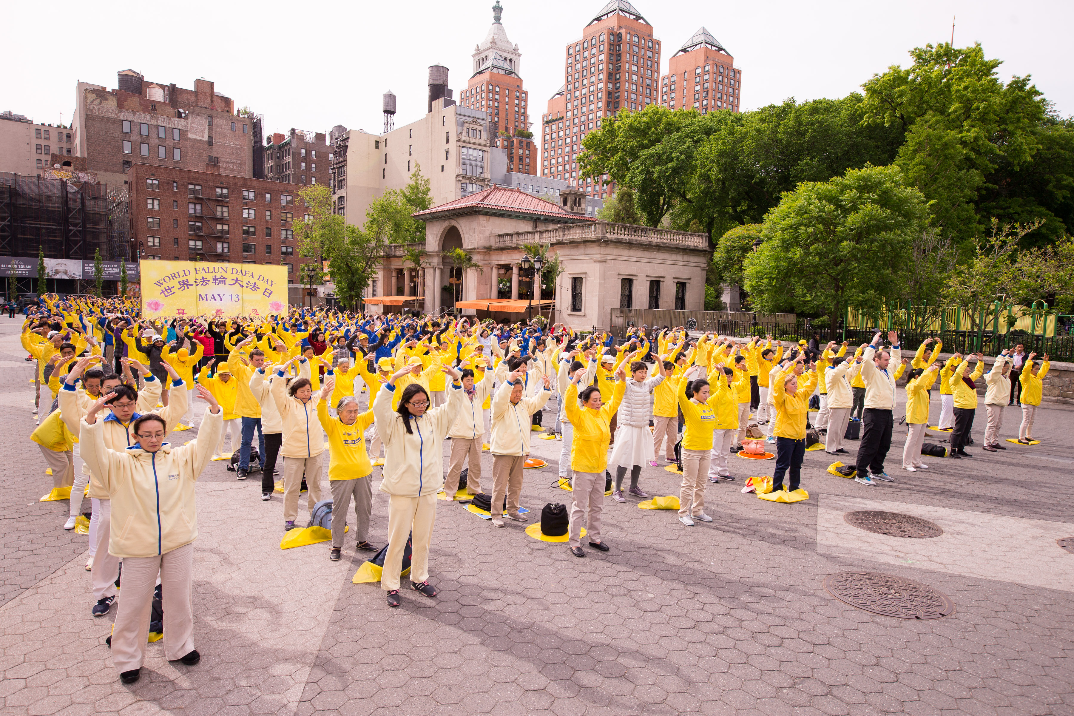 图1-4:五月十一日清晨,各族裔法轮功学员在曼哈顿中城联合广场集体炼功,跟民众分享大法的美好。