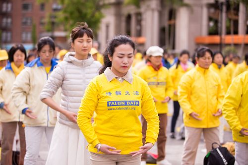 【明慧网二零一七年五月十三日】(明慧记者舒慧纽约报道)五月十一日清晨,晨阳初起,空气中虽有凉意,纽约人一如既往的匆忙;不过,法轮功学员陆续来到曼哈顿中城联合广场,十人一排,在舒缓的音乐中,从容淡定,缓、慢、圆,炼着法轮功功法。不少路人驻足观看,并向学员了解法轮功。法轮功学员们跟他们分享了自己修炼大法身心获益的体会,也表达了对李洪志师父传授大法,令自己身心受益的感恩。