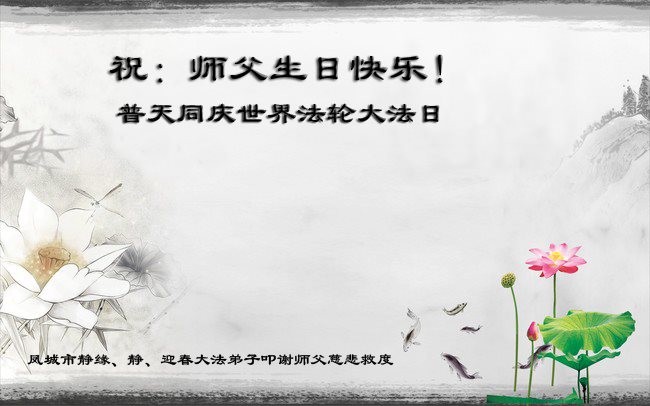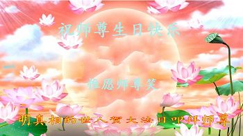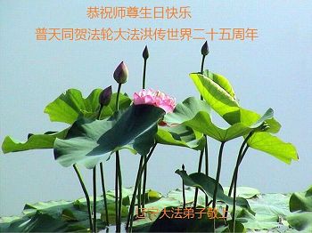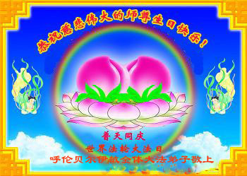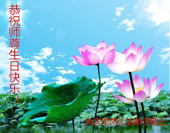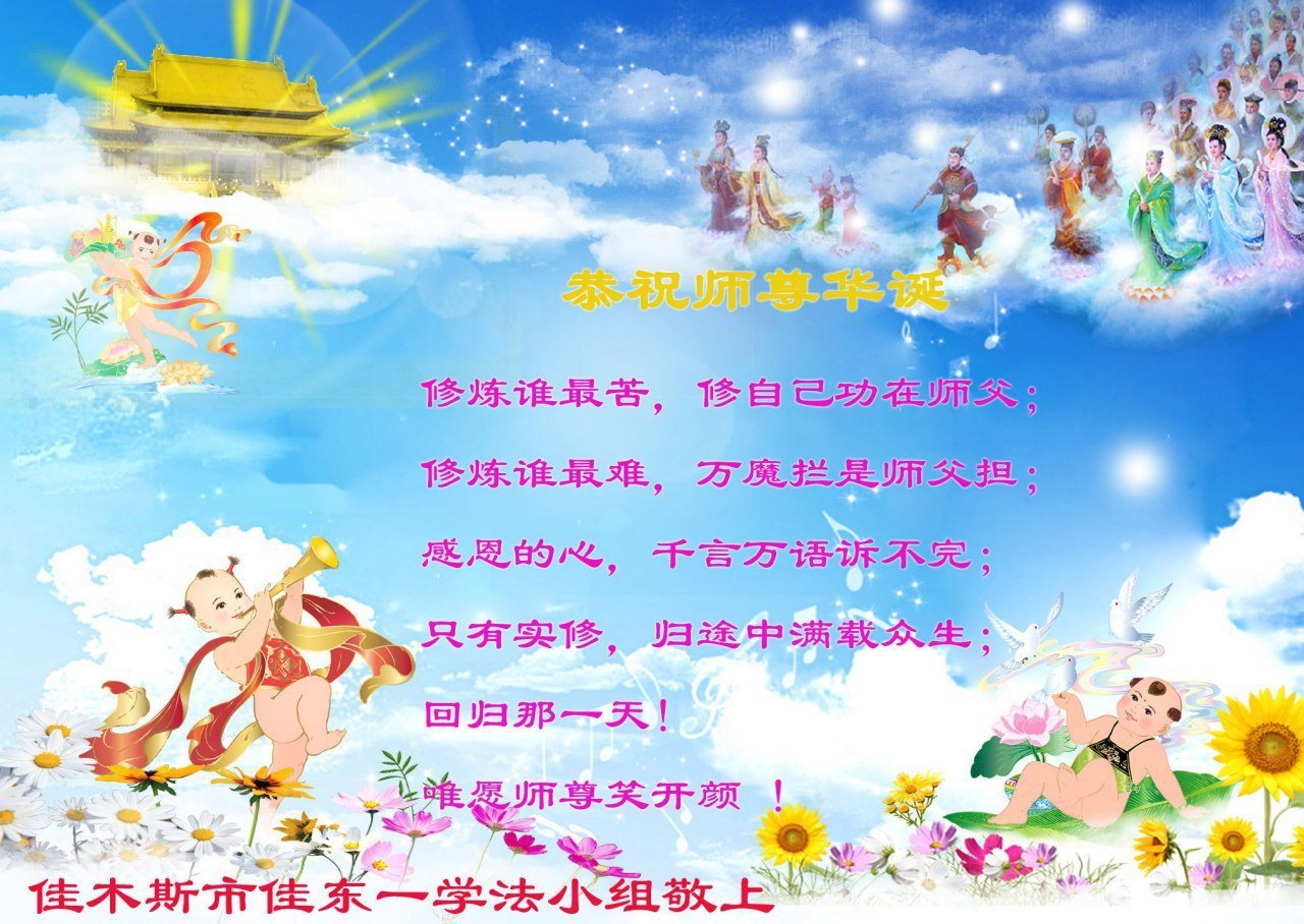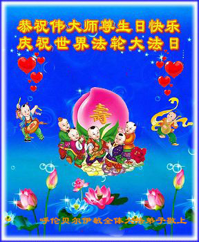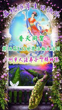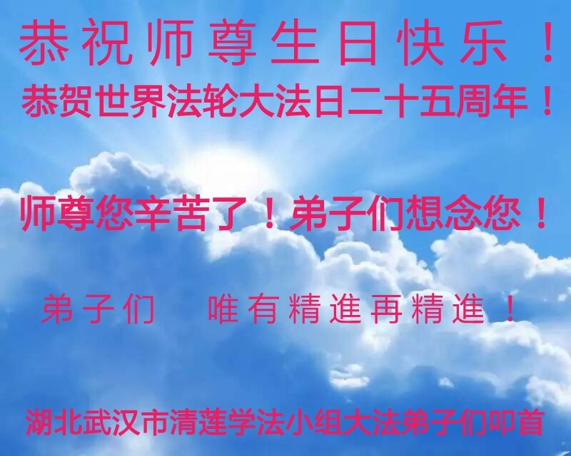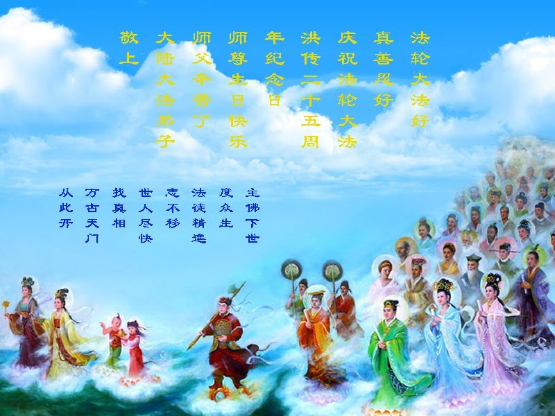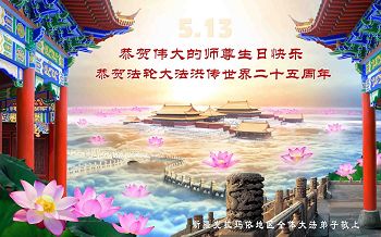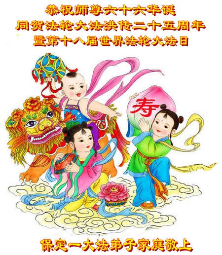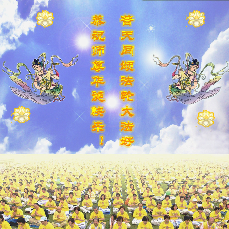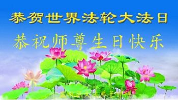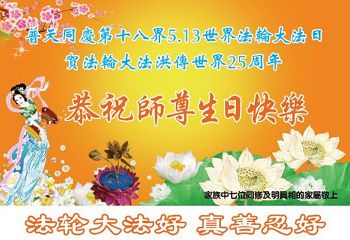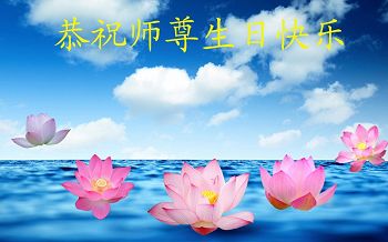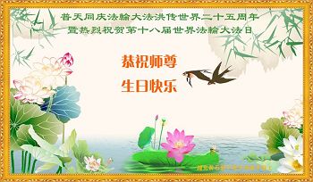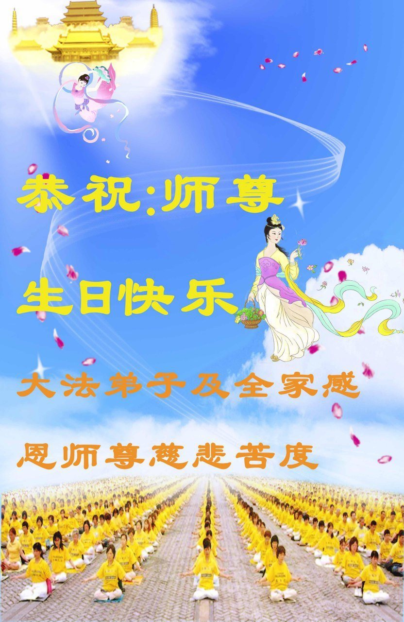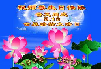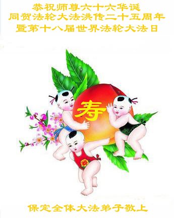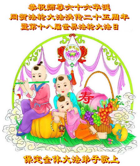 师尊您好!弟子们无法用语言无限感恩师尊的慈悲苦度!叩祝慈悲伟大的师尊生日快乐!并与世界各地各位大法弟子及明真相的世人普天同庆法轮大法洪传二十五周年暨欢庆第十八届世界法轮大法日!