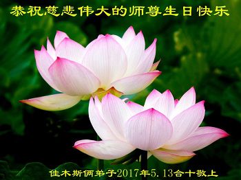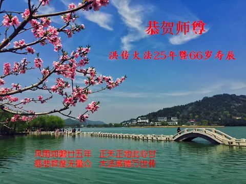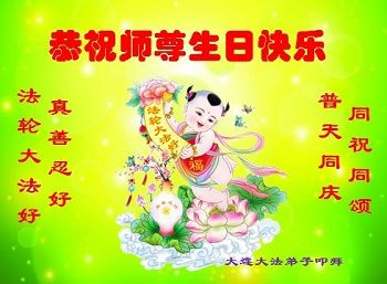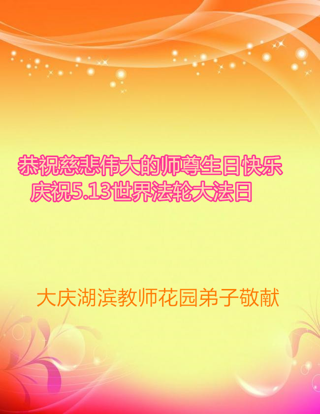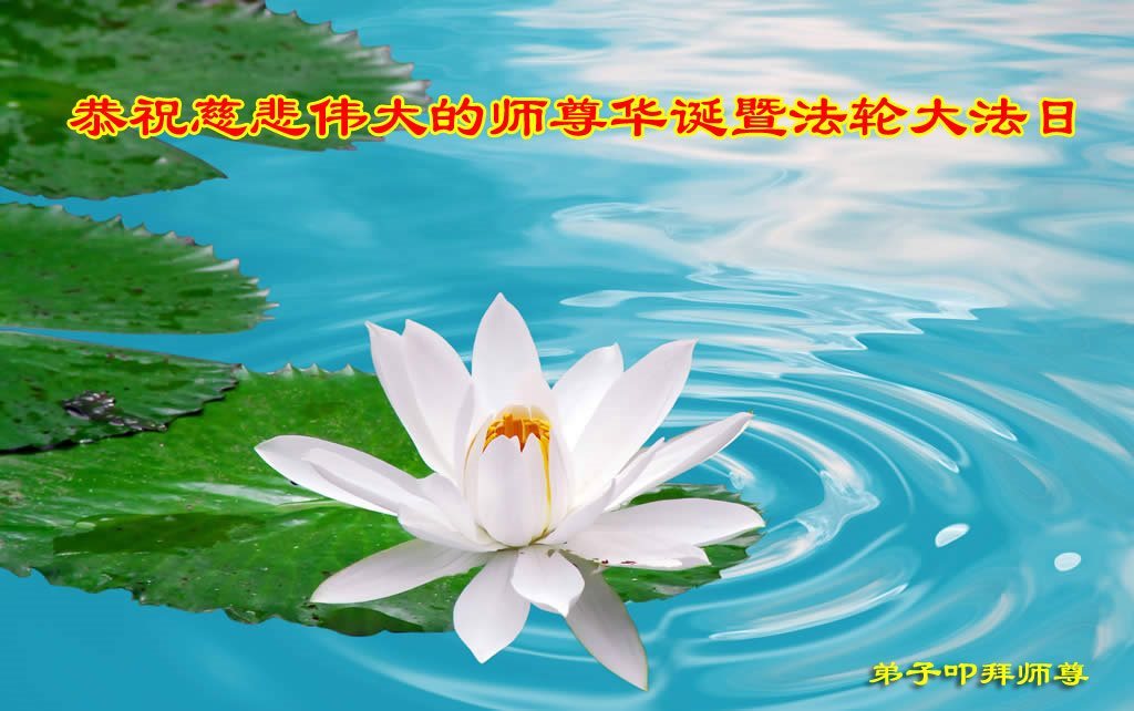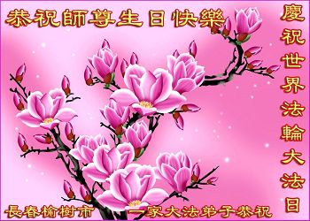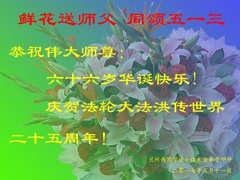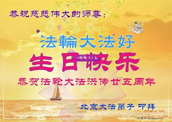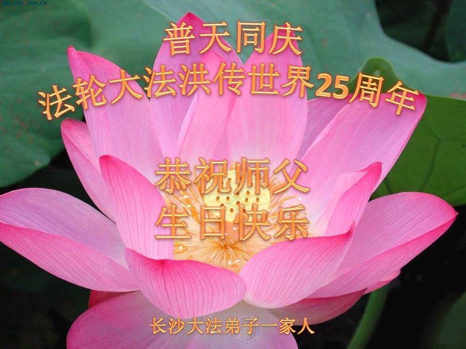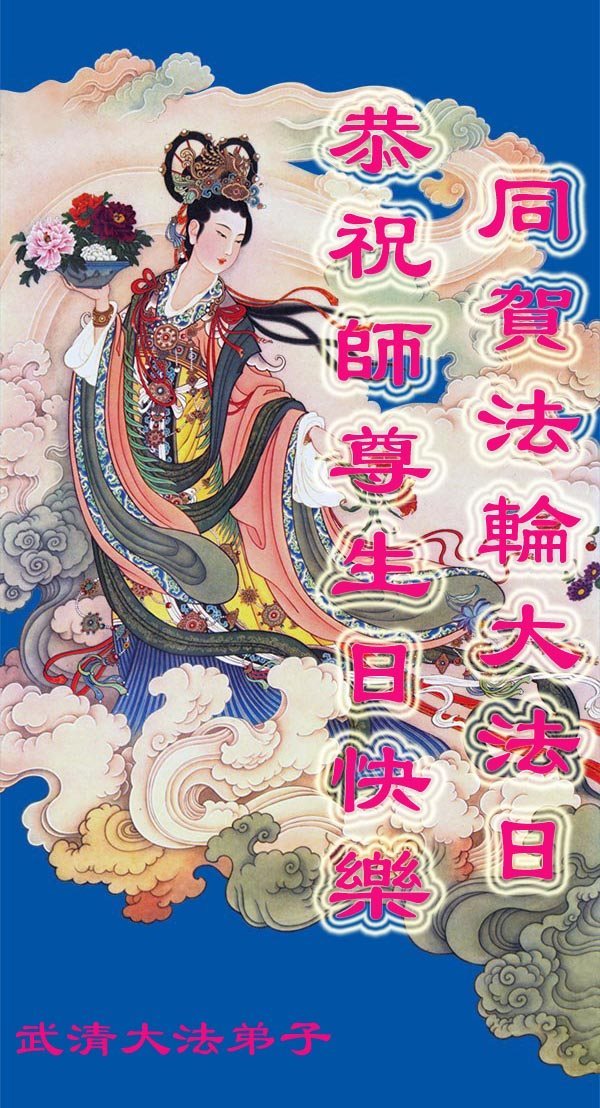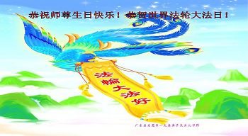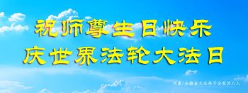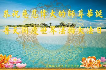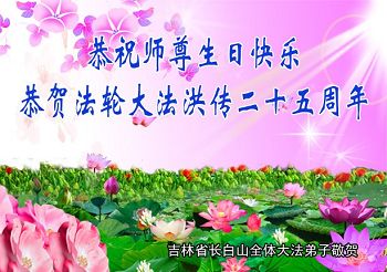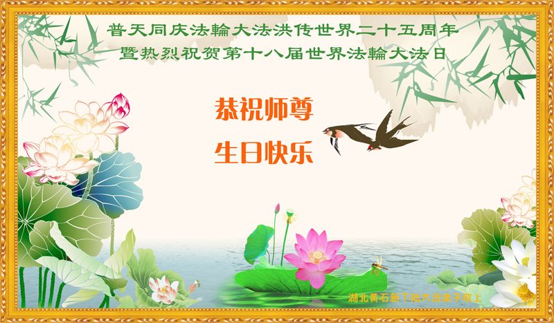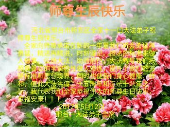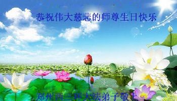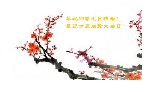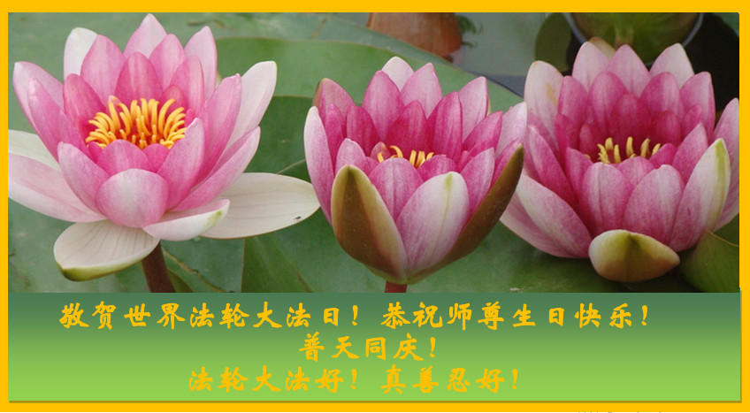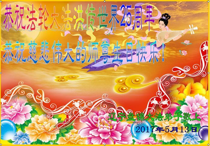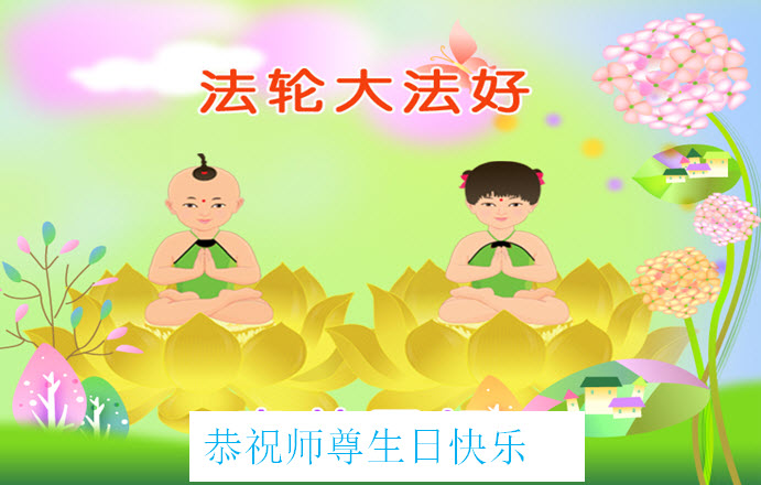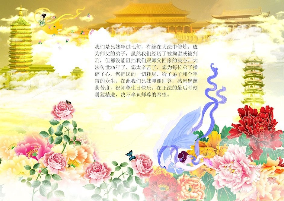 师尊您好!弟子们无法用语言无限感恩师尊的慈悲苦度!叩祝慈悲伟大的师尊生日快乐!并与世界各地各位大法弟子及明真相的世人普天同庆法轮大法洪传二十五周年暨欢庆第十八届世界法轮大法日!