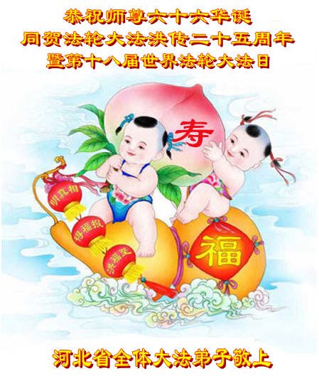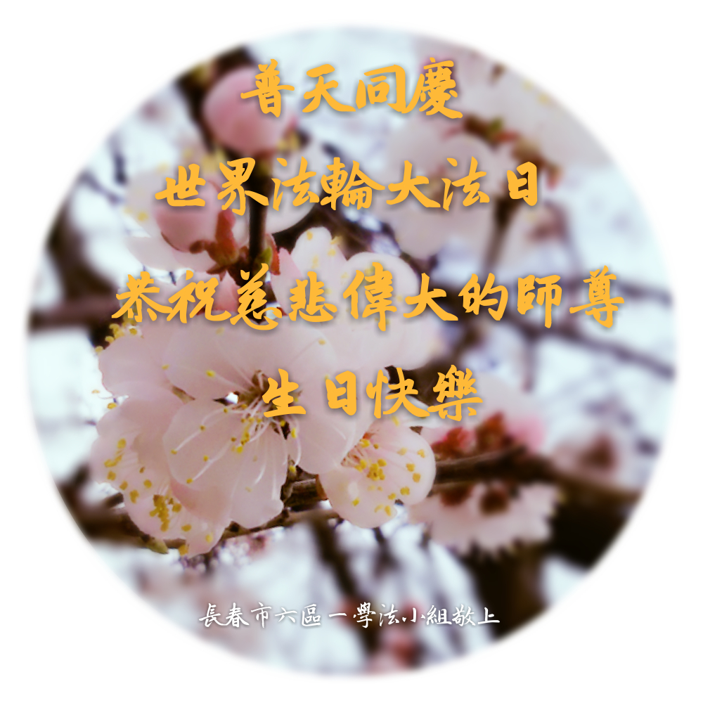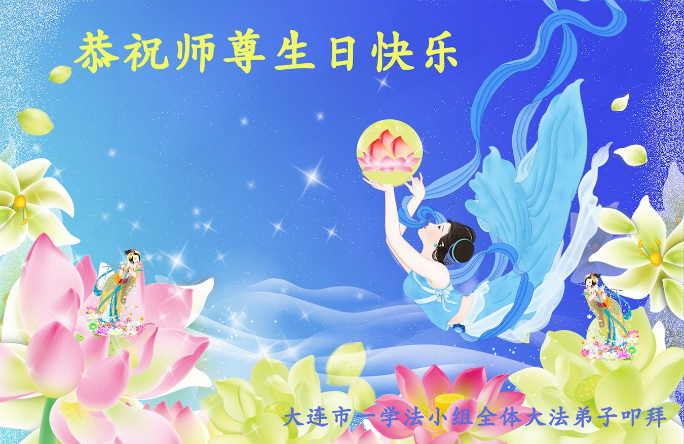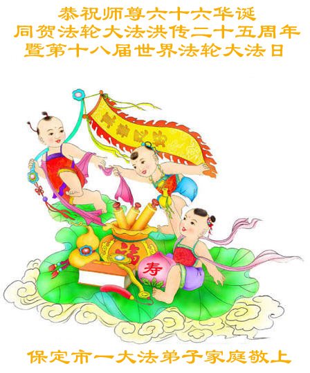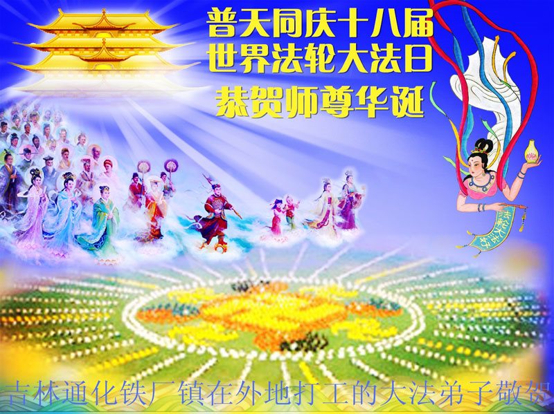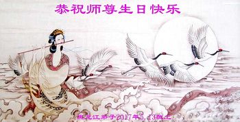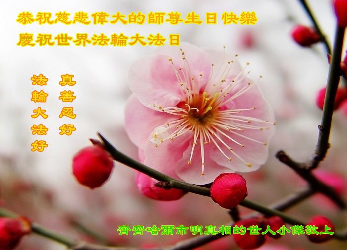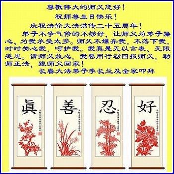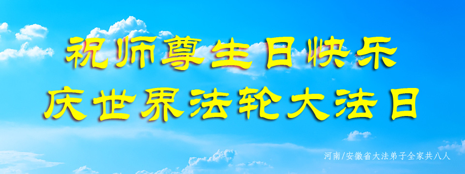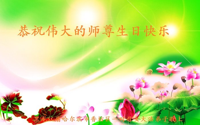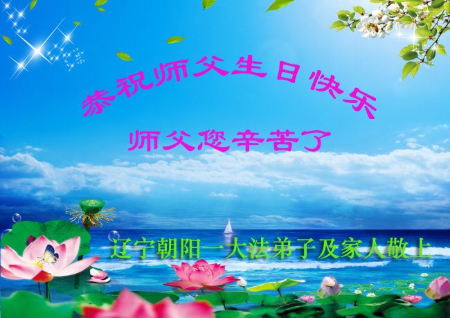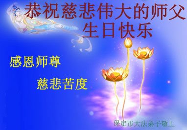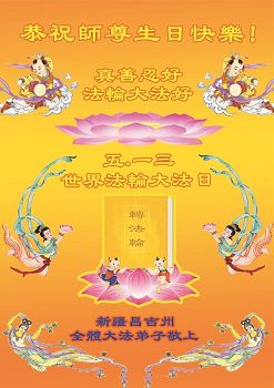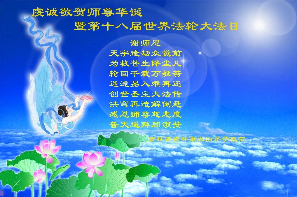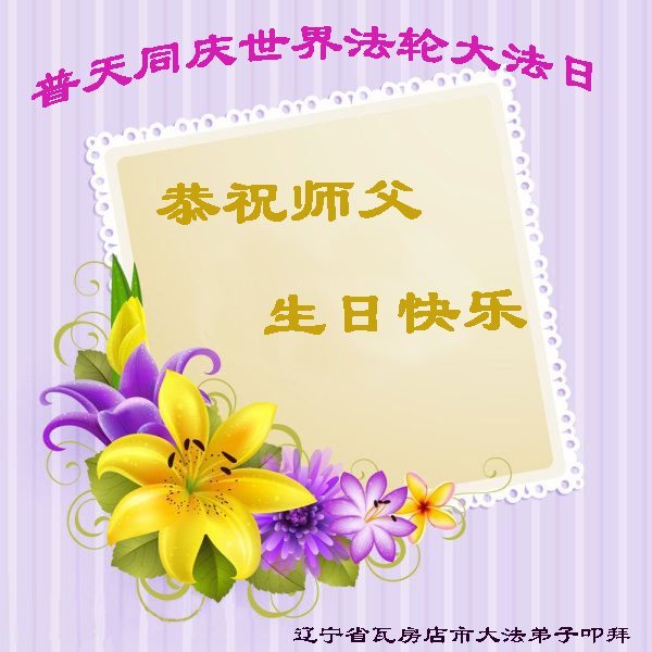 师尊您好!弟子们无法用语言无限感恩师尊的慈悲苦度!叩祝慈悲伟大的师尊生日快乐!并与世界各地各位大法弟子及明真相的世人普天同庆法轮大法洪传二十五周年暨欢庆第十八届世界法轮大法日!
