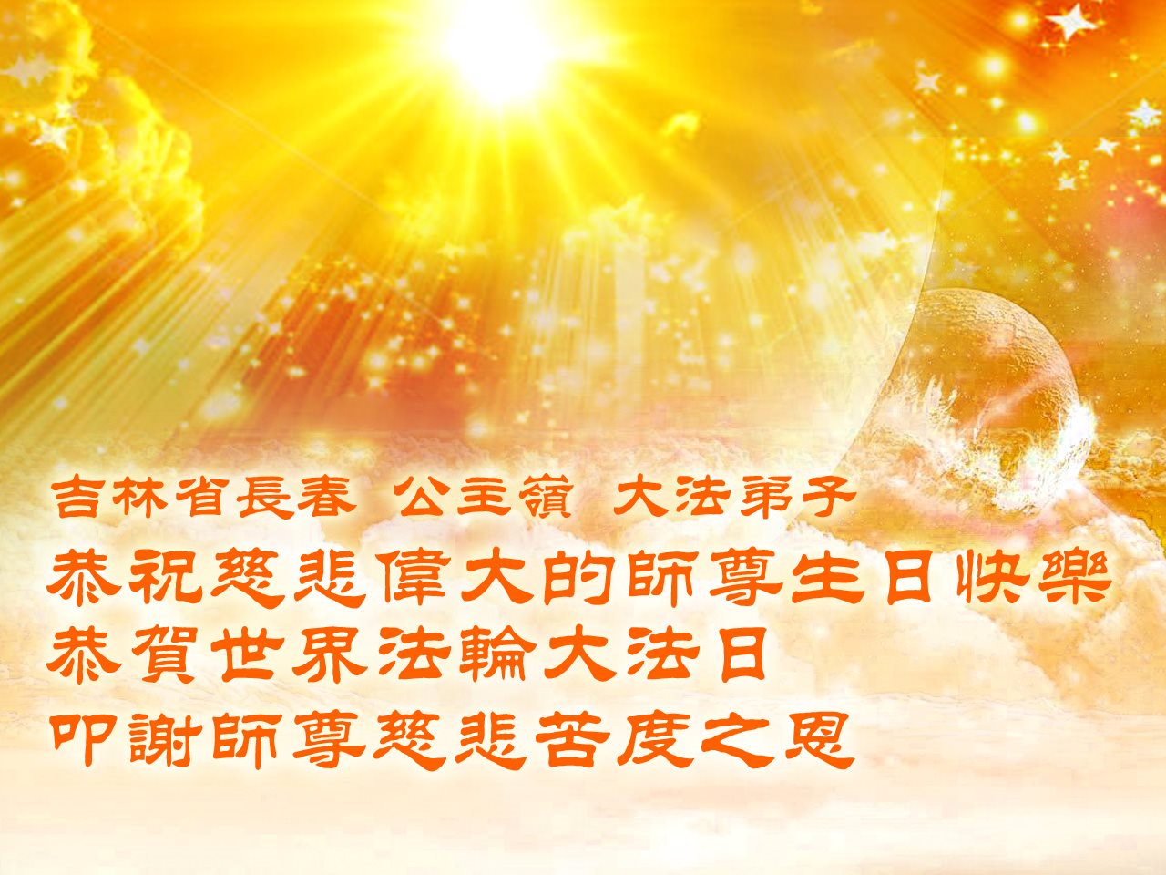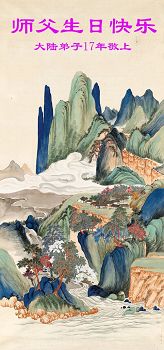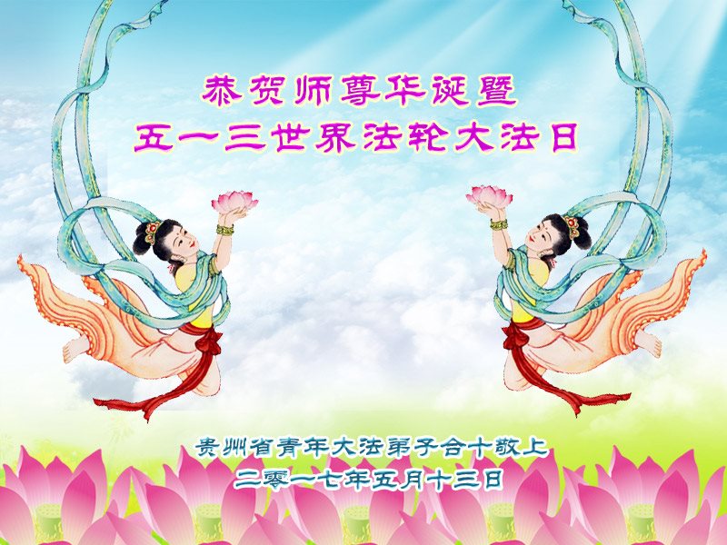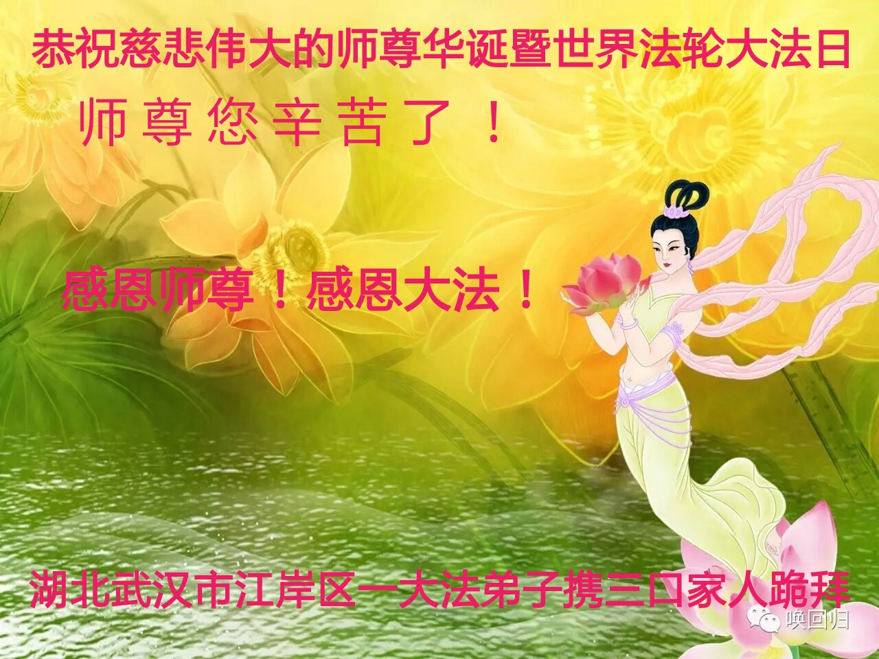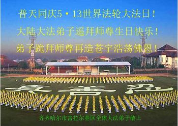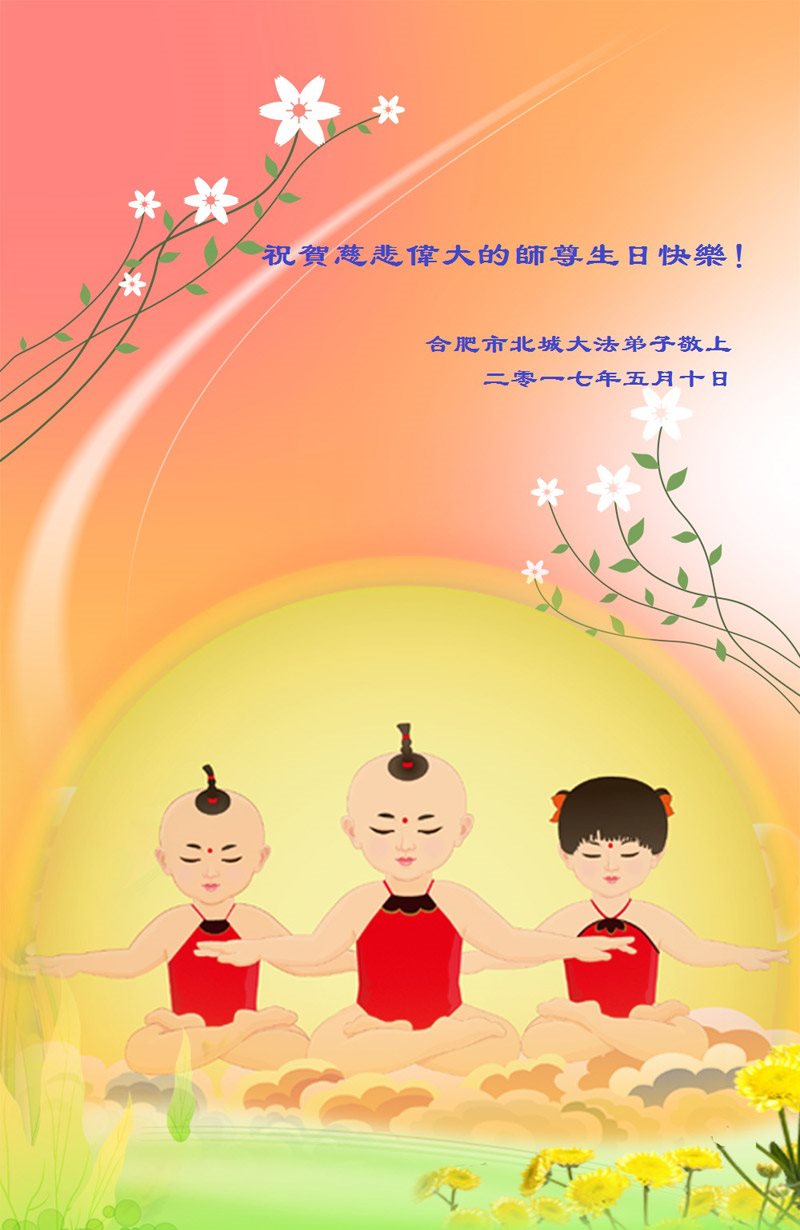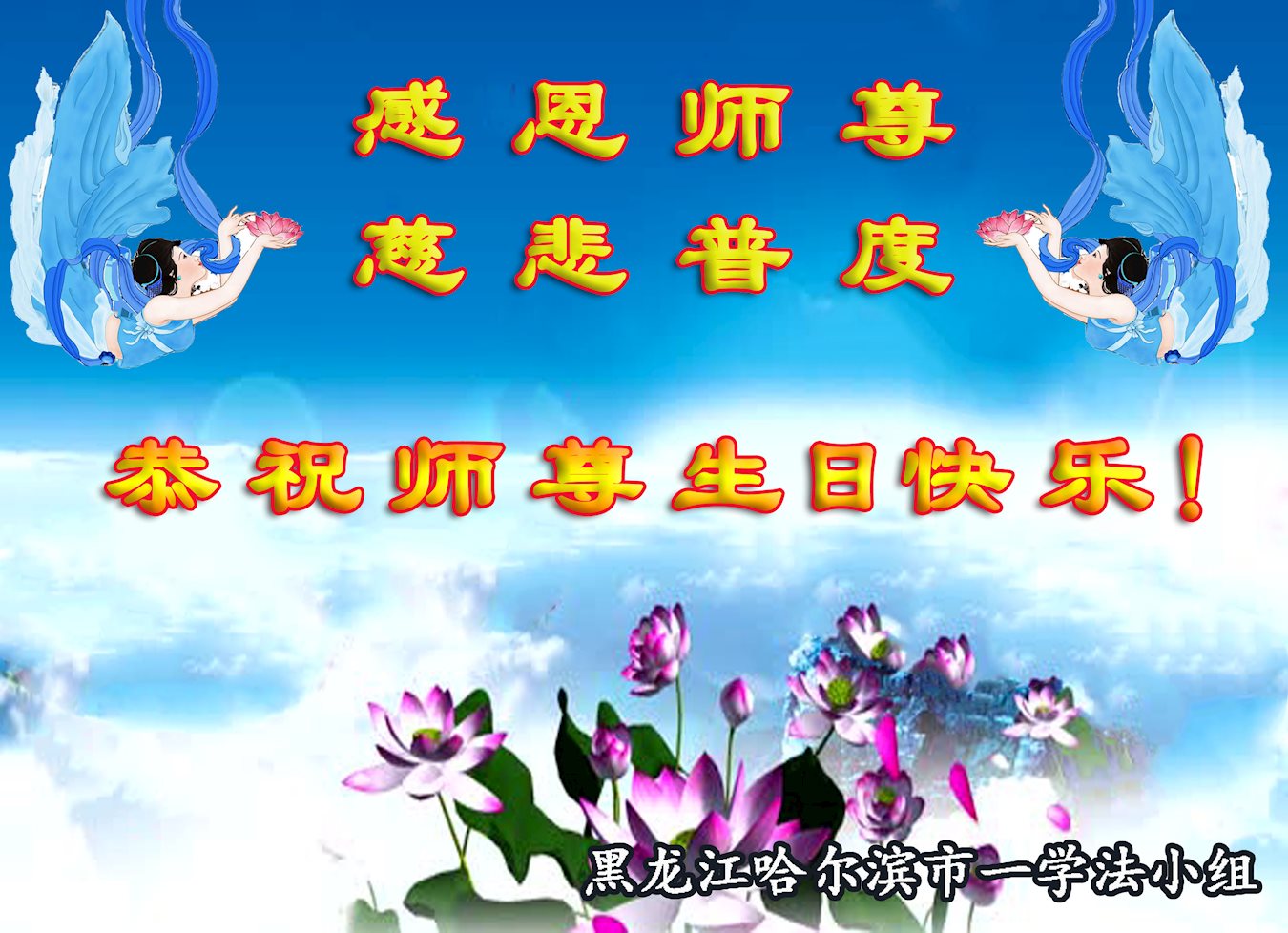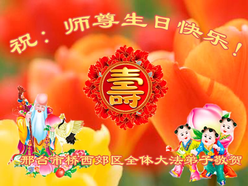 师尊您好!弟子们无法用语言无限感恩师尊的慈悲苦度!叩祝慈悲伟大的师尊生日快乐!并与世界各地各位大法弟子及明真相的世人普天同庆法轮大法洪传二十五周年暨欢庆第十八届世界法轮大法日!