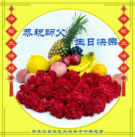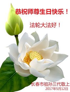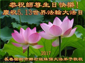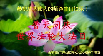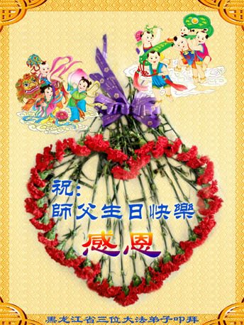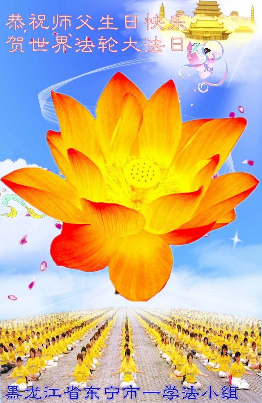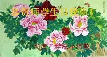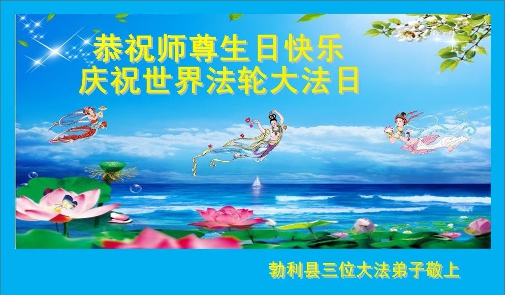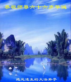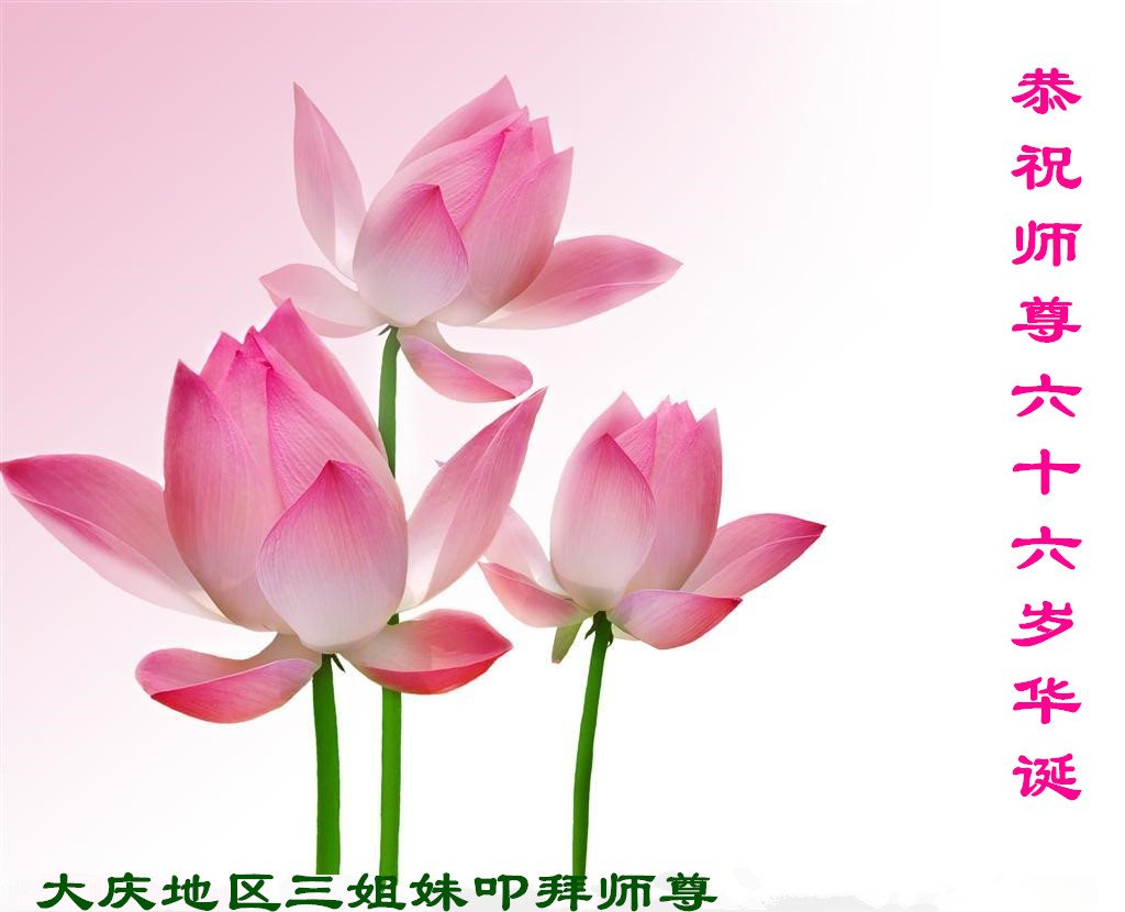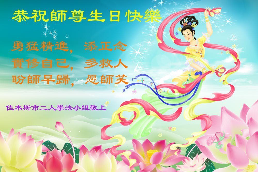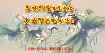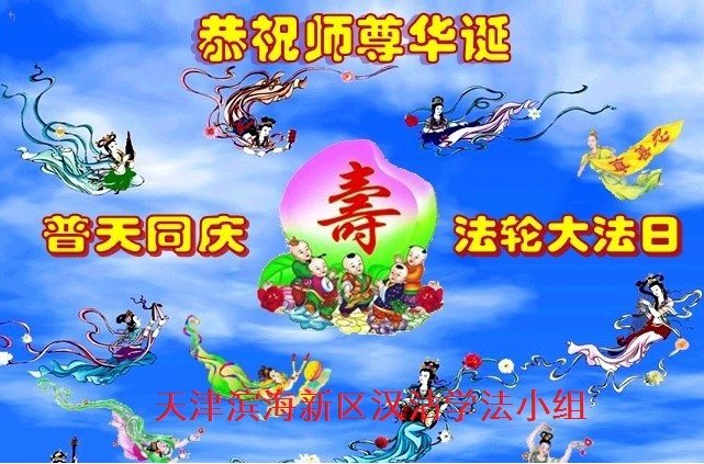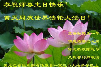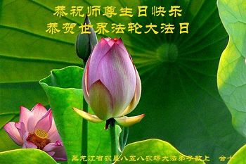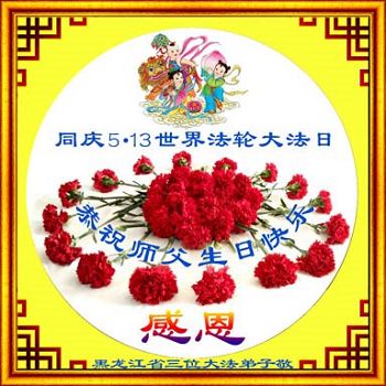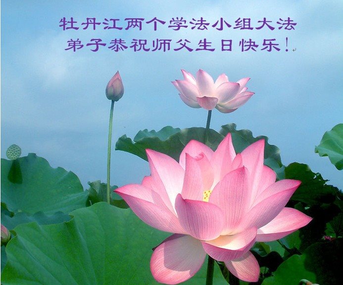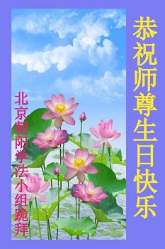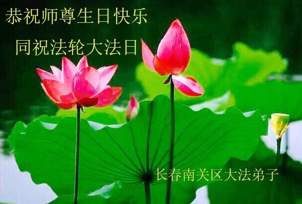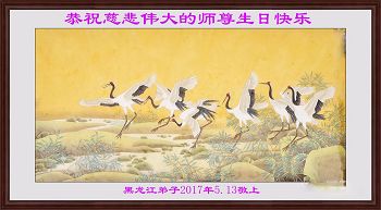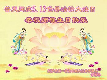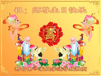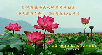 我们学法小组的三位大法弟子是被邪党绑架后,在邪恶的劳教所被迫害时相识的。是师尊的呵护使我们走过了那段日子。值此普天同庆之时,对师尊的感恩无以言表,我们用最虔诚的心恭祝伟大师尊生日快乐!同庆世界法轮大法日!等待师父回国、等待神韵回国演出。