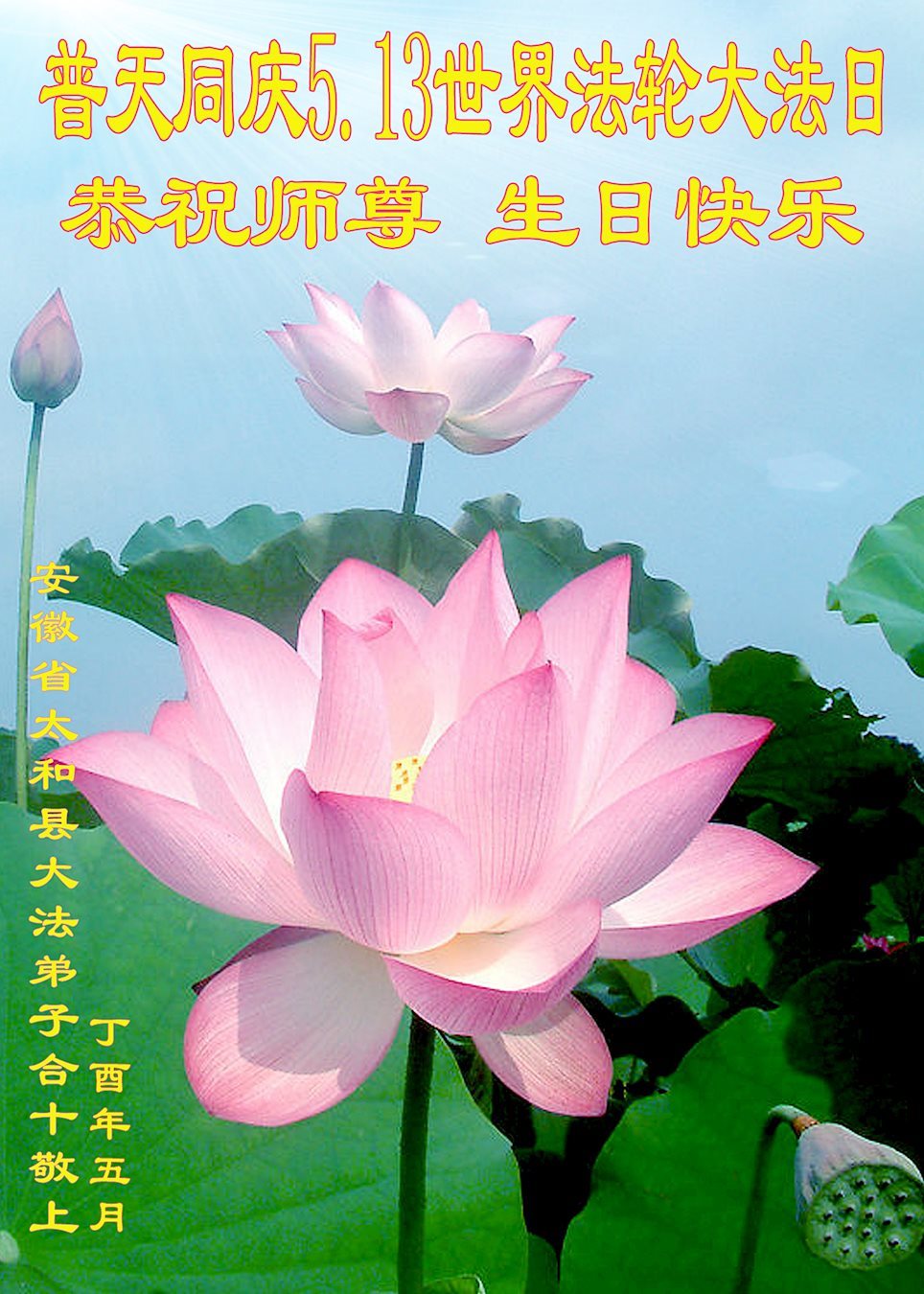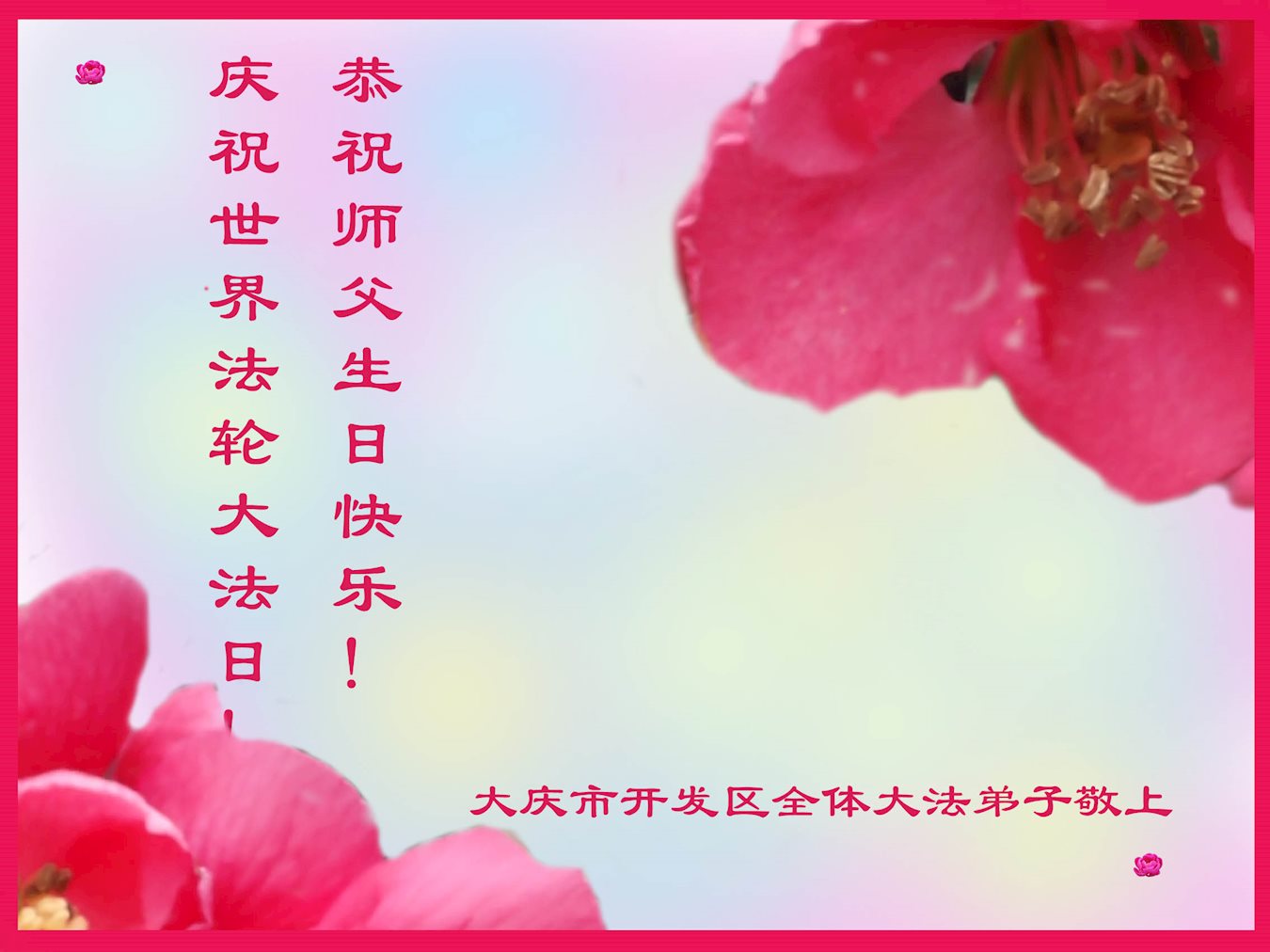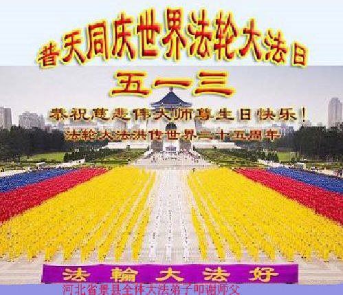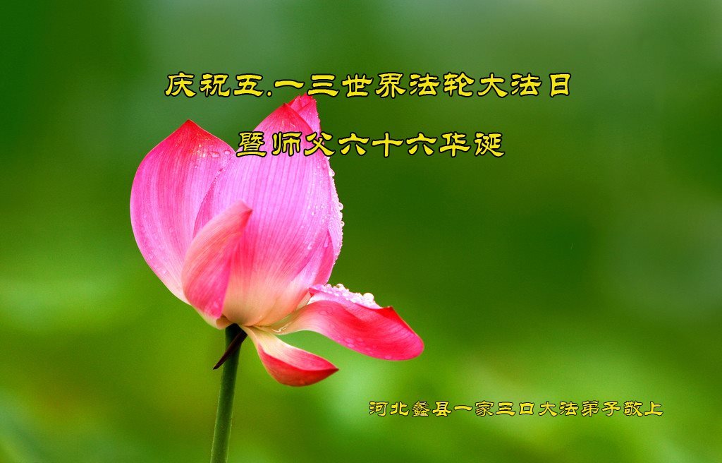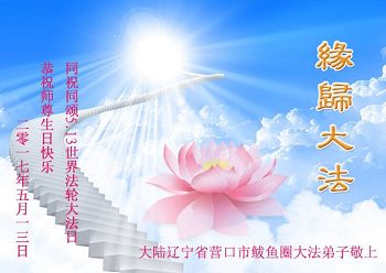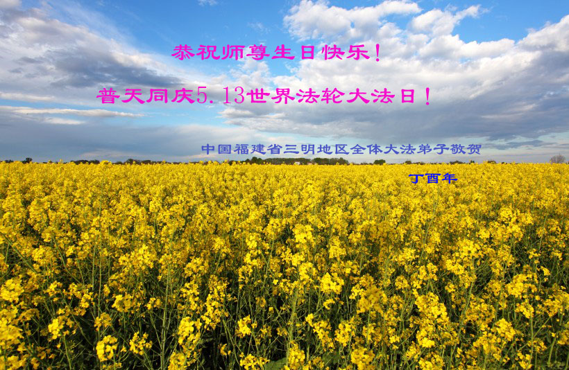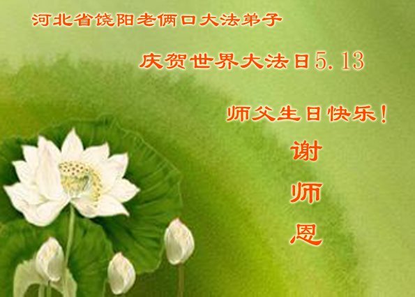 普天同庆世界法轮大法日!清原县大法弟子及明真相的家人们和邻居同修向慈悲伟大的师尊问好!弟子们感谢慈悲伟大的师尊慈悲救度!弟子们跪拜师尊,恭祝慈悲伟大的师尊生日快乐!
