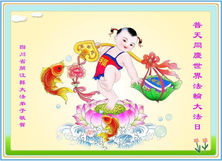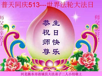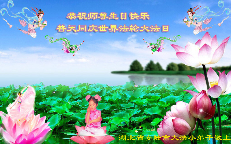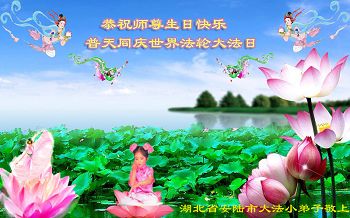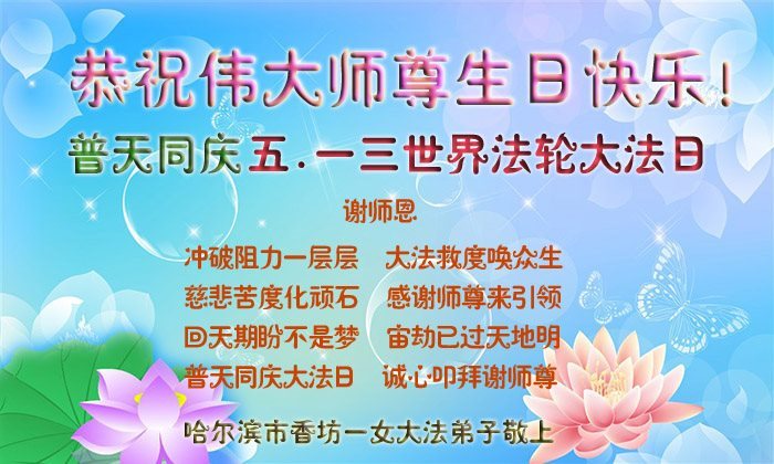 我是法轮大法弟子的子女,这些年来从我的父辈身上见证了法轮大法的美好,他们从一身病体变的健康,待人友善,家庭和睦。在世界法轮大法日到来之际,向李大师问好,恭祝李大师生日快乐!恭贺世界法轮大法日。