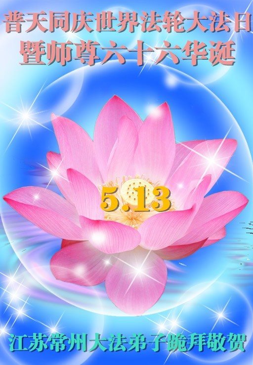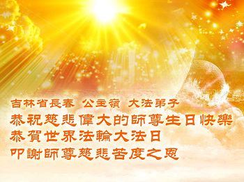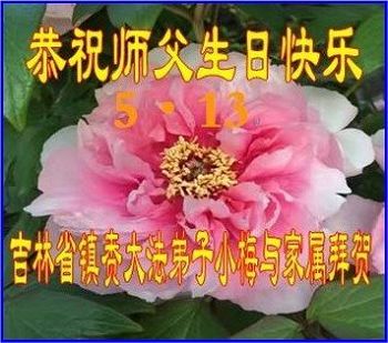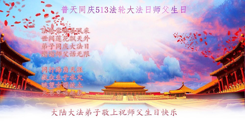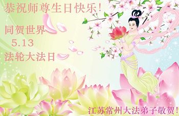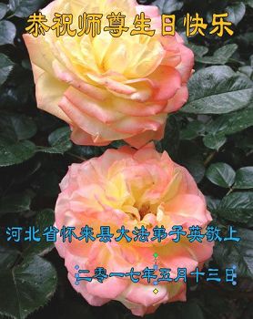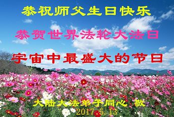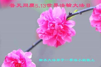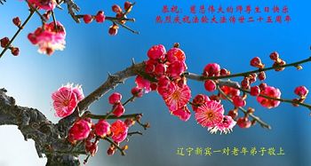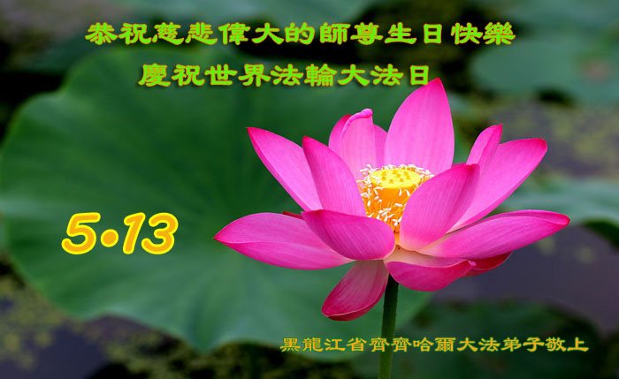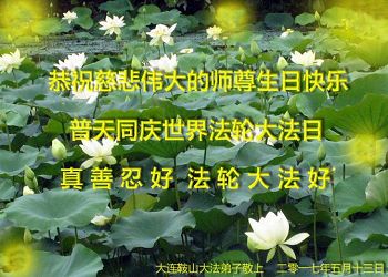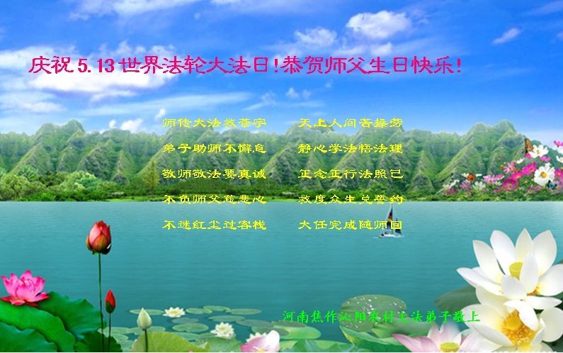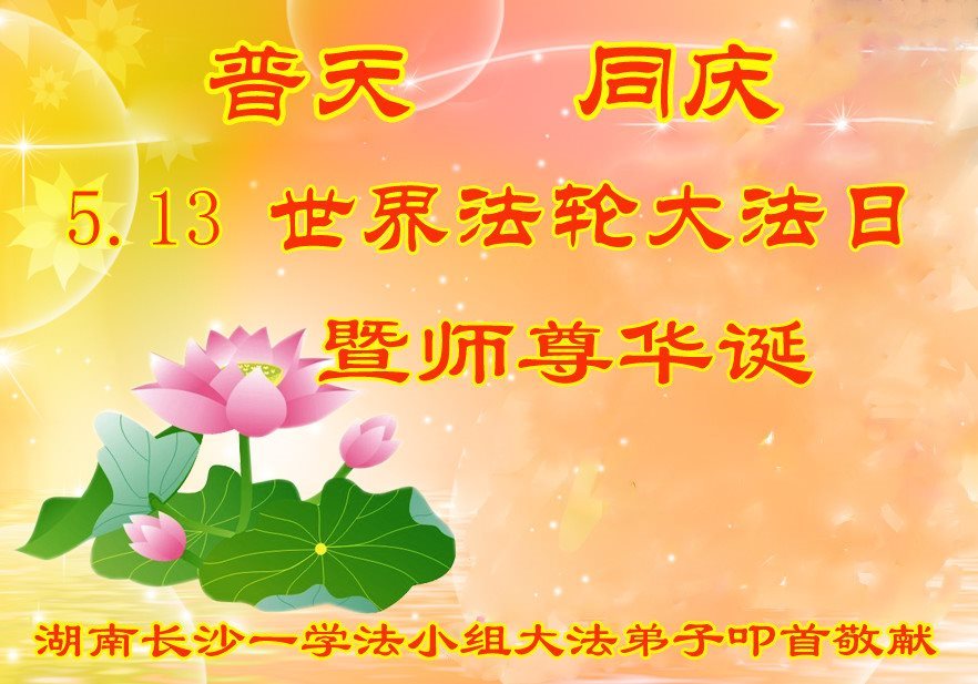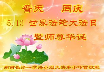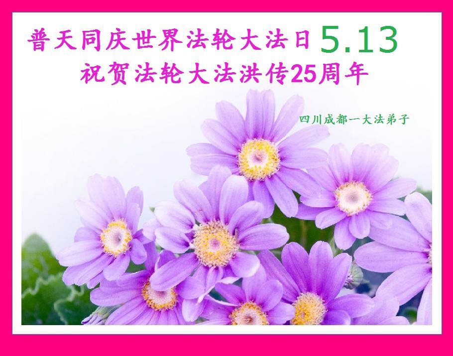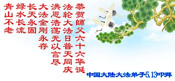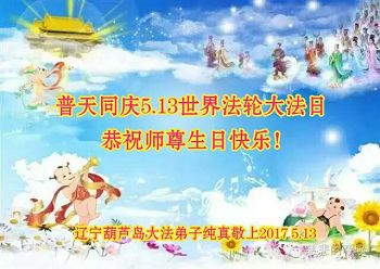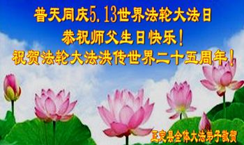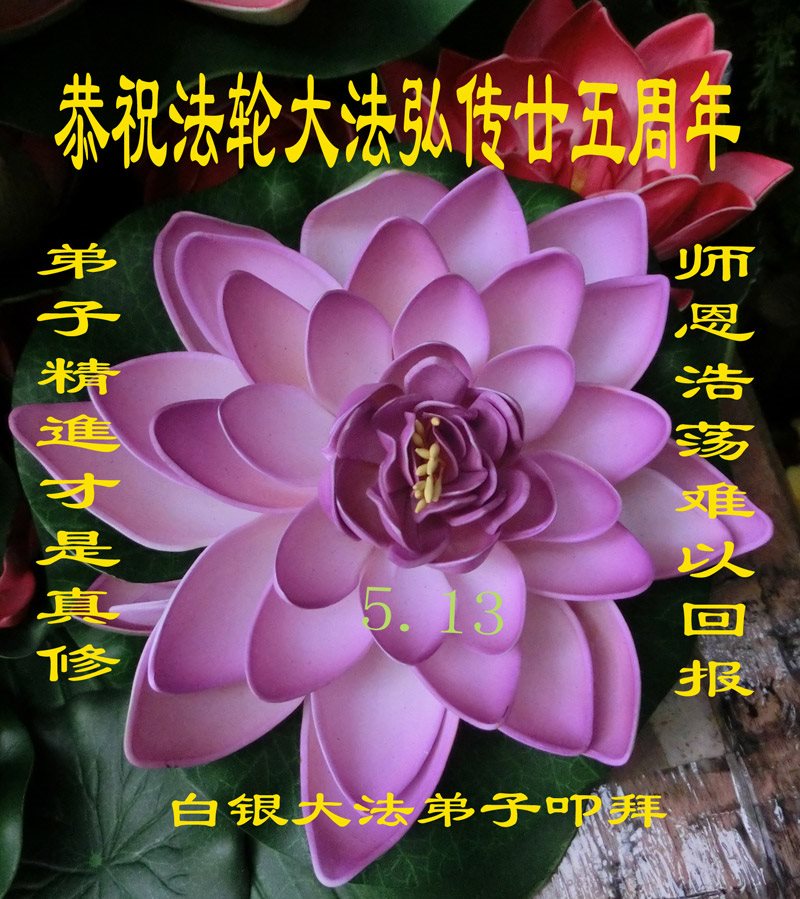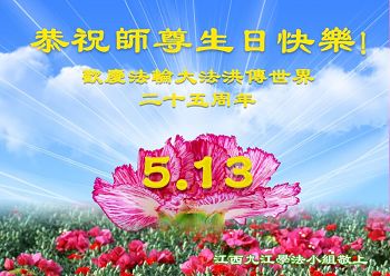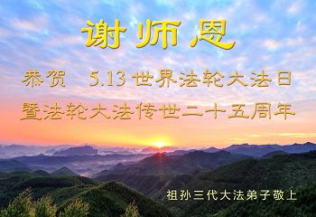 在五月十三日来临之际,我在这里祝贺法轮大法洪传二十五周年,同时祝李老师生日快乐!这二十五年来,万兴能有法轮大法的出现,是真善忍改变了这个世界,让人们真正认识到了什么才是宇宙的真理。然而在中共统治下的中国,却违背人伦,对信仰真善忍的好人无理打压,肆意抓捕、迫害,让这些好人蒙冤,我真心希望天灭中共之日早些到来,早日将这些迫害法轮大法好人的罪犯绳之以法,让他们得到应有的惩罚。