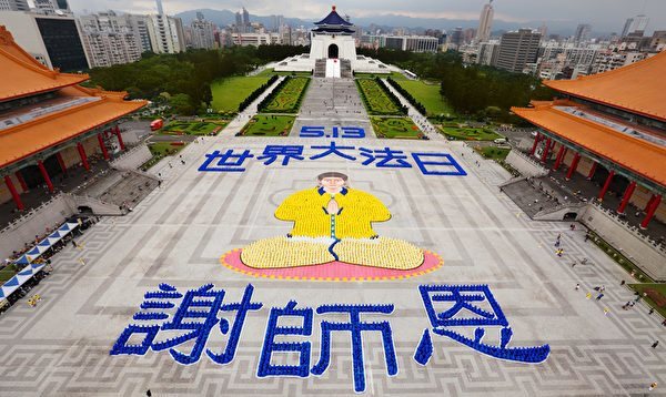 ![]() 图1:庆祝“世界法轮大法日”,法轮功学员冒雨排出“法正乾坤” 四个大字。 |