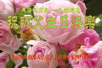 请师父加持弟子,精進,精進,再精進!一位大法弟子的家里人。明真相的公公 给师父磕头,祝师父66岁华诞快乐!师父拯救了人类!功德无量!法轮大法好!真善忍好!明真相的丈夫给师父磕头。祝师父生日快乐!谢谢师父给了我一个和睦家庭,给我家族带来了幸福!