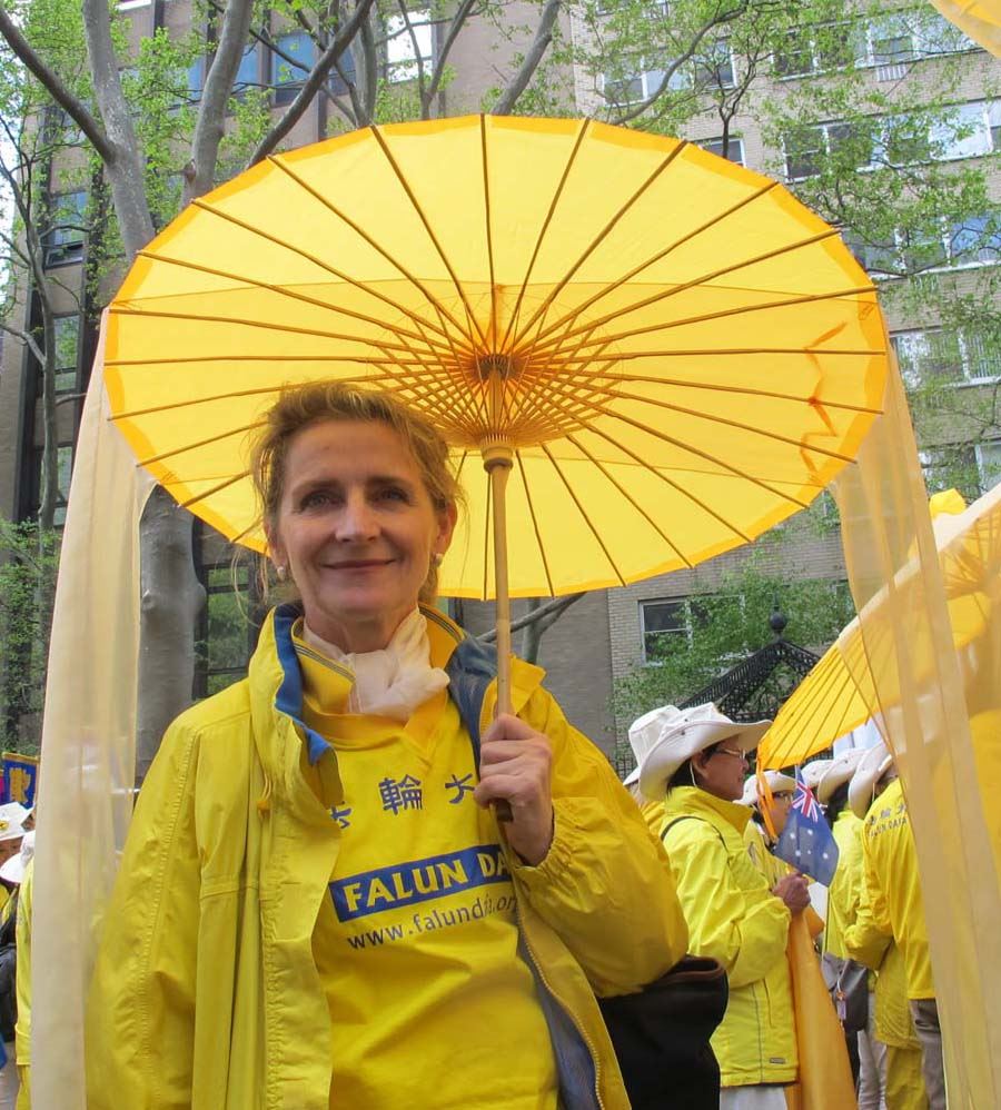 简·伦斯福德(Jean Lunsford)和她的同修来自密西根,她们被打湿的脸颊露着发自内心的笑容。伦斯福德从一九九七年开始接触法轮功,她觉得真正的在法轮大法中修炼是在二零零五年阅读了《转法轮》后才了解到修炼的真义。对于能有机会参加今天的活动她表示:“我非常的高兴今天能来这里参加这个活动。我不感到冷,也不感到潮湿,我只是感到那么的高兴!我希望整个世界都知道法轮大法好!”