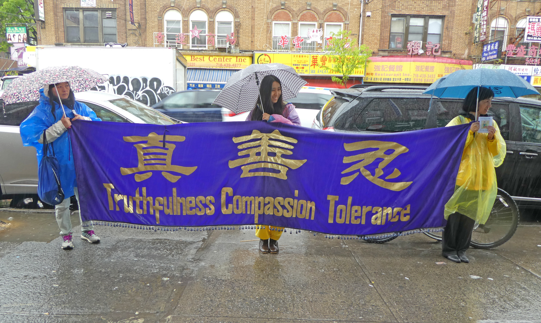 对于今天在风雨中排字约瑟夫觉得:今年是我第二次参加纽约的活动。天下着雨,但每个人都很快乐,大家脸上挂着笑容,这里的能量场很强,很好。大家如同一个大家庭,每个人都在为别人着想,都是很好的人。他对自己能站在“法正乾坤”的“乾”字部位感到很自豪。