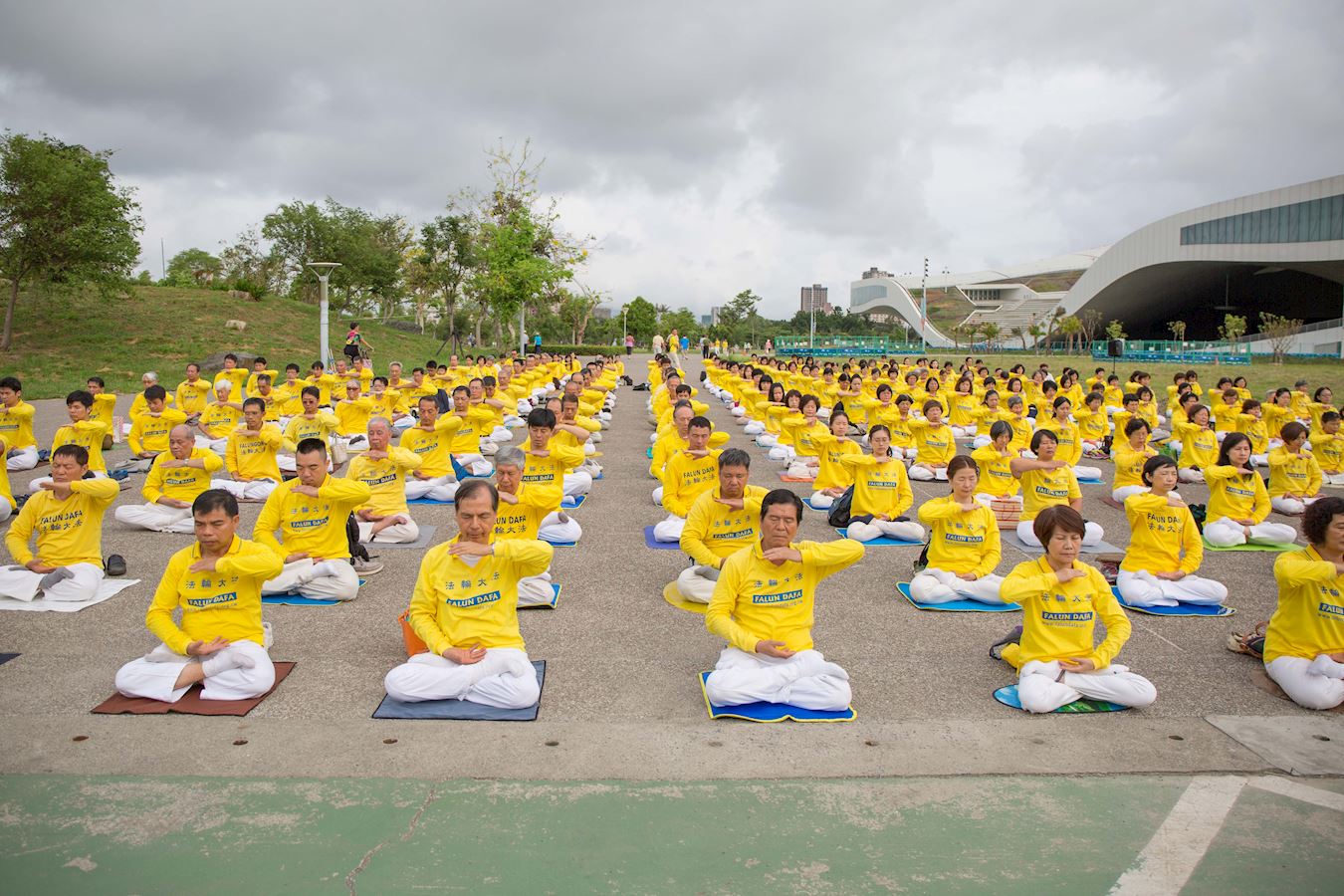当天,虽然风雨交加,可是并没有动摇法轮功学员的初衷,他们陆陆续续搭渡轮来到与曼哈顿仅投石之遥的总督岛。中午十二点多由约一千五百名法轮功学员在岛上排出“法正乾坤” 四个大字。