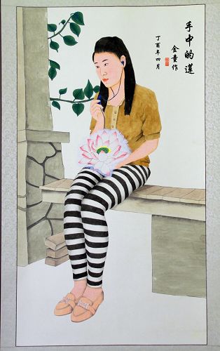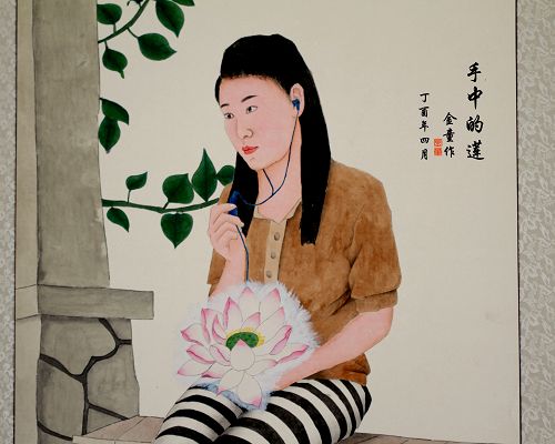 作品主要是想表现大陆大法弟子在被迫害的情况下用真相手机讲真相救人的慈悲之举。她左手拿着手机右手举着麦克风,心态平和慈祥的向世人传送着大法的真相,手机也闪烁着一朵朵莲花。