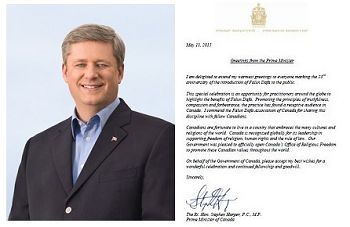 加拿大前总理哈珀,曾连续十年给法轮大法学会发出贺信,称赞法轮功对社会作出的贡献。2015年,哈珀总理在对法轮功庆典活动的贺信中说:“我很高兴向各位致以最热忱的问候,祝贺法轮大法传世23周年。这个特殊的庆典使全球的法轮功学员们再一次把法轮大法的福祉展现给人们。通过倡导真、善、忍的理念,十年法轮大法的修炼得到了加拿大人的认同。我赞扬法轮大法学会与加拿大同胞分享这一修炼方法。”
