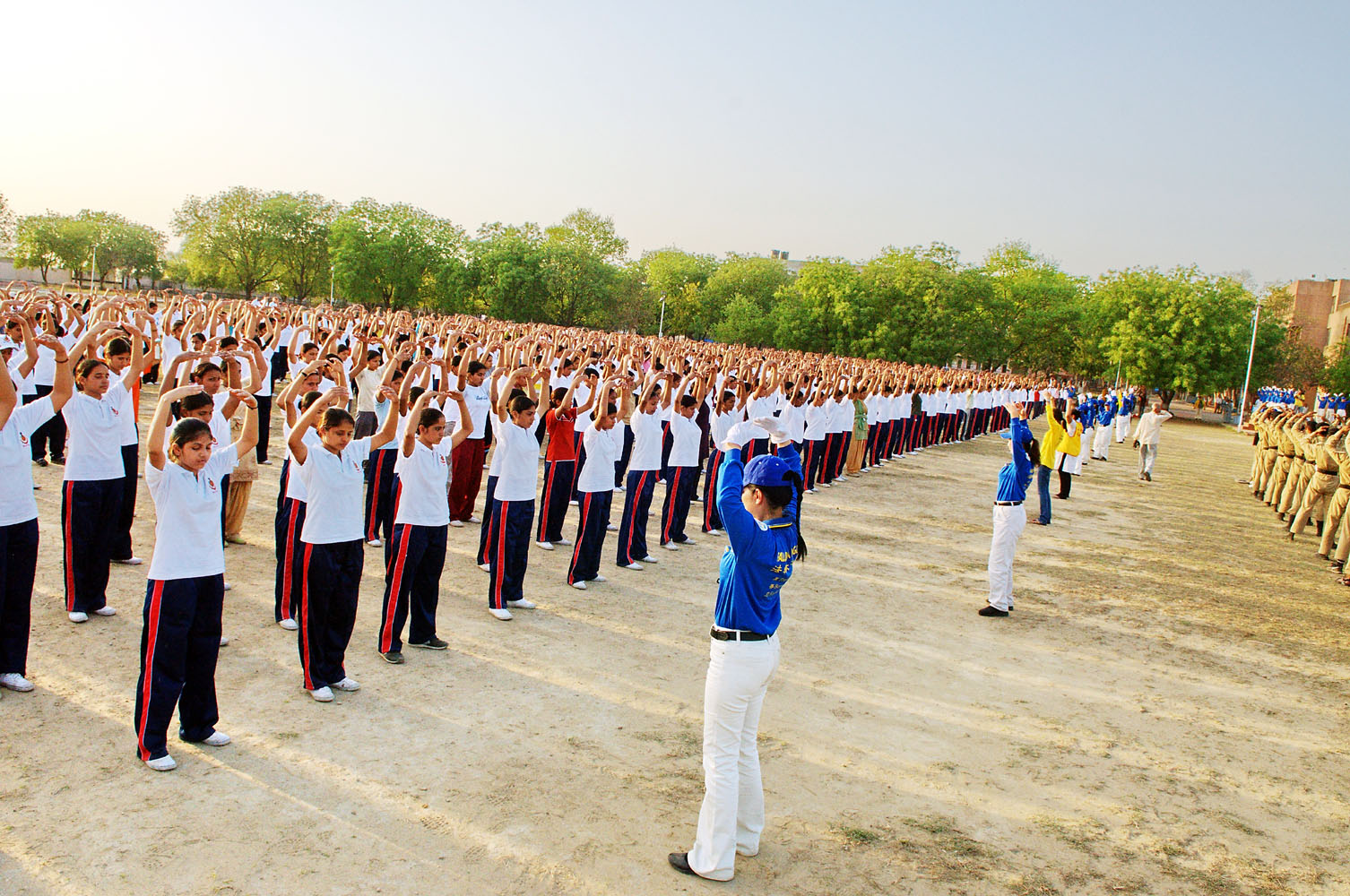 ![]() 印度首都德里“警察训练大学”上千学生一起学炼法轮功。 |