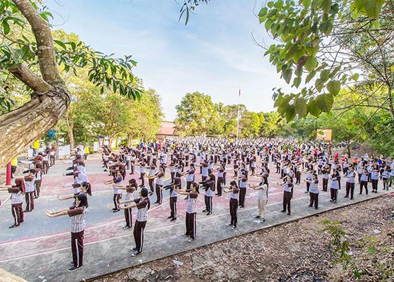 为庆祝即将到来的法轮大法弘传25周年,印度尼西亚巴淡岛的法轮大法修炼者到各学校里向更多的人介绍这种古老的身心修炼方法。