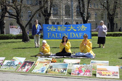 ![]() 图1-2:拉脱维亚(Latvia)法轮功学员在拉脱维亚大学和国家歌剧院之间的公园里举行讲真相活动 |