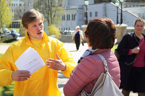 ![]() 图3-5:拉脱维亚法轮功学员向驻足的民众传播真相 |
