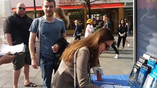 在活动期间,不断有一批批的行人了解真相后支持法轮功的征签。还有的停下来开始学炼起功法。