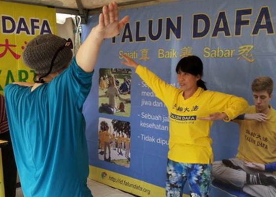 在2017年5月6日的当地文化节上,印尼雅加达法轮功学员设置了一个摊位,向当地人介绍法轮大法(又称法轮功)。