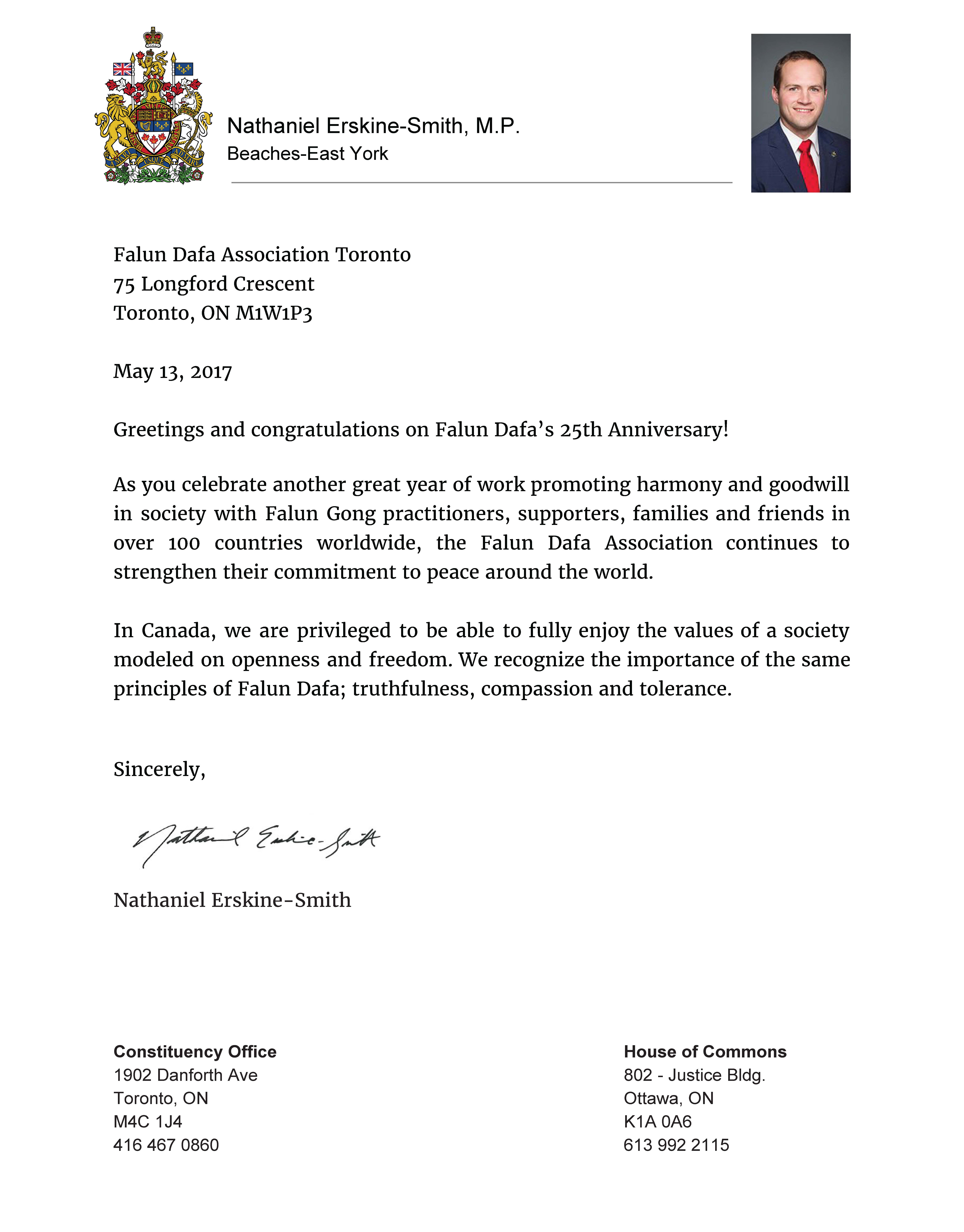 联邦国会议员厄斯金-史密斯(Nathaniel Erskine-Smith)在贺信中写道:“祝福和恭贺法轮大法传世25周年!”“随着法轮大法修炼者、支持者、家人及朋友们又一年在全球100多个国家传播平和与福音,法轮大法学会继续为全球的和平贡献心力。”史密斯表示,在加拿大,人们享有充分的自由和公正的价值观,同时“我们认可法轮大法理念──真、善、忍的重要性!”