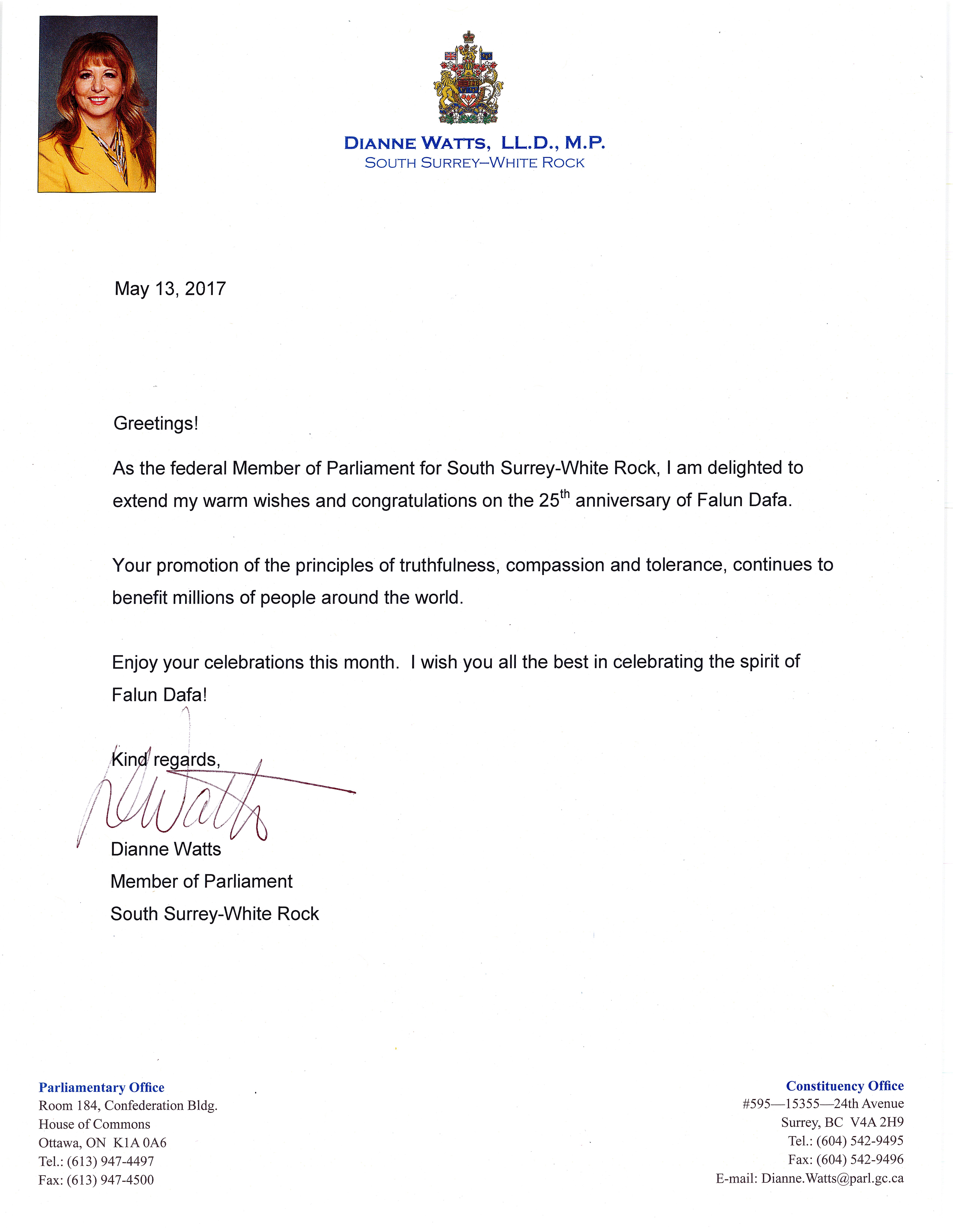 ![]() 国会议员华特丝(Dianne Watts)贺信 |
