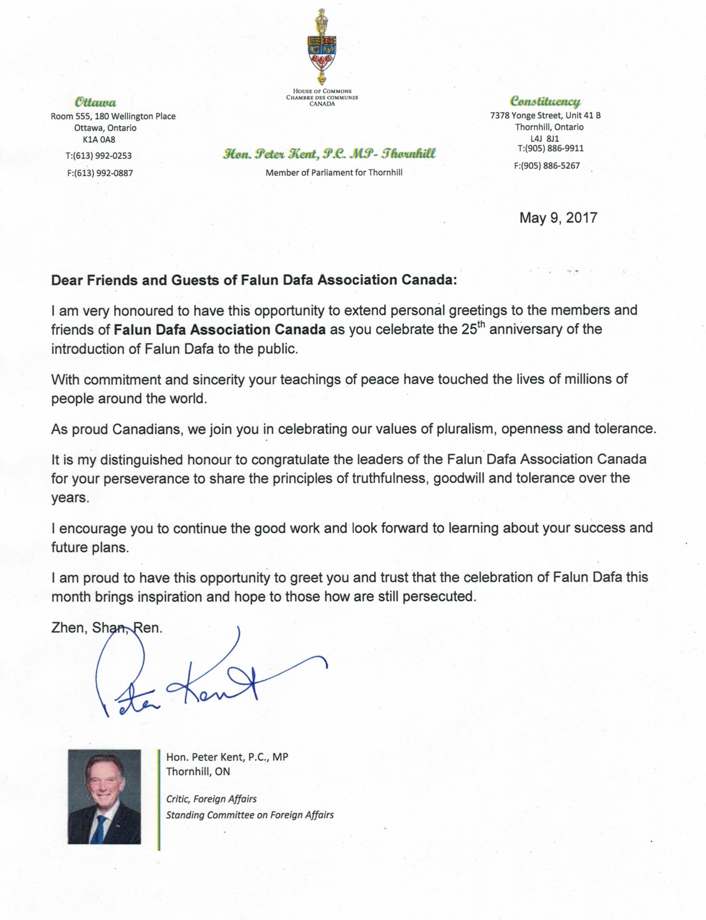 前联邦部长、资深国会议员、国会法轮功之友主席彼得·肯特(Peter Kent)多次为法轮大法日发出贺信。在今年的贺信中,肯特议员写道:“在你们庆祝法轮大法传世25周年之际,我非常荣幸能有此机会向加拿大法轮大法修炼者和法轮大法学会的朋友们表达我的祝贺!”