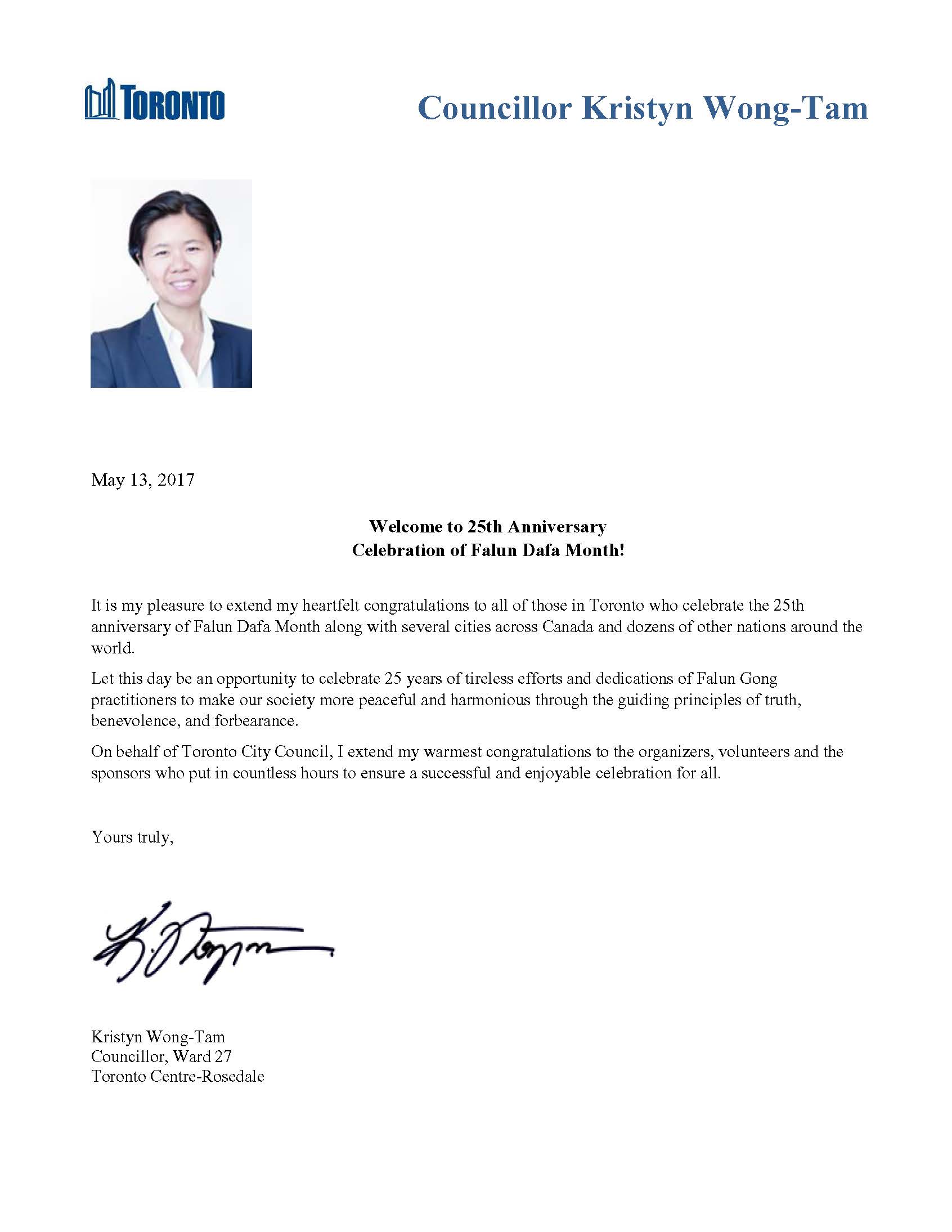 曾多次发贺信祝贺法轮大法月的多伦多华裔市议员黄慧文(Kristyn Wong-Tam)在今年的贺信中写道:“能向多伦多,以及加拿大多个城市和世界各地庆祝法轮大法月的所有人表达我最衷心的祝愿,这让我深感荣幸。”她在贺信中表示:“借此机会,庆贺25年来法轮大法修炼者实践真、善、忍理念,让我们的社会变得更加和平、更加和睦所付出的孜孜不倦的努力。”“谨代表多伦多市议会,我要向庆典活动的主办者、义工、赞助方致以最热切的祝贺,你们付出无数的辛勤努力,为公众带来这欢乐成功的庆典活动。”