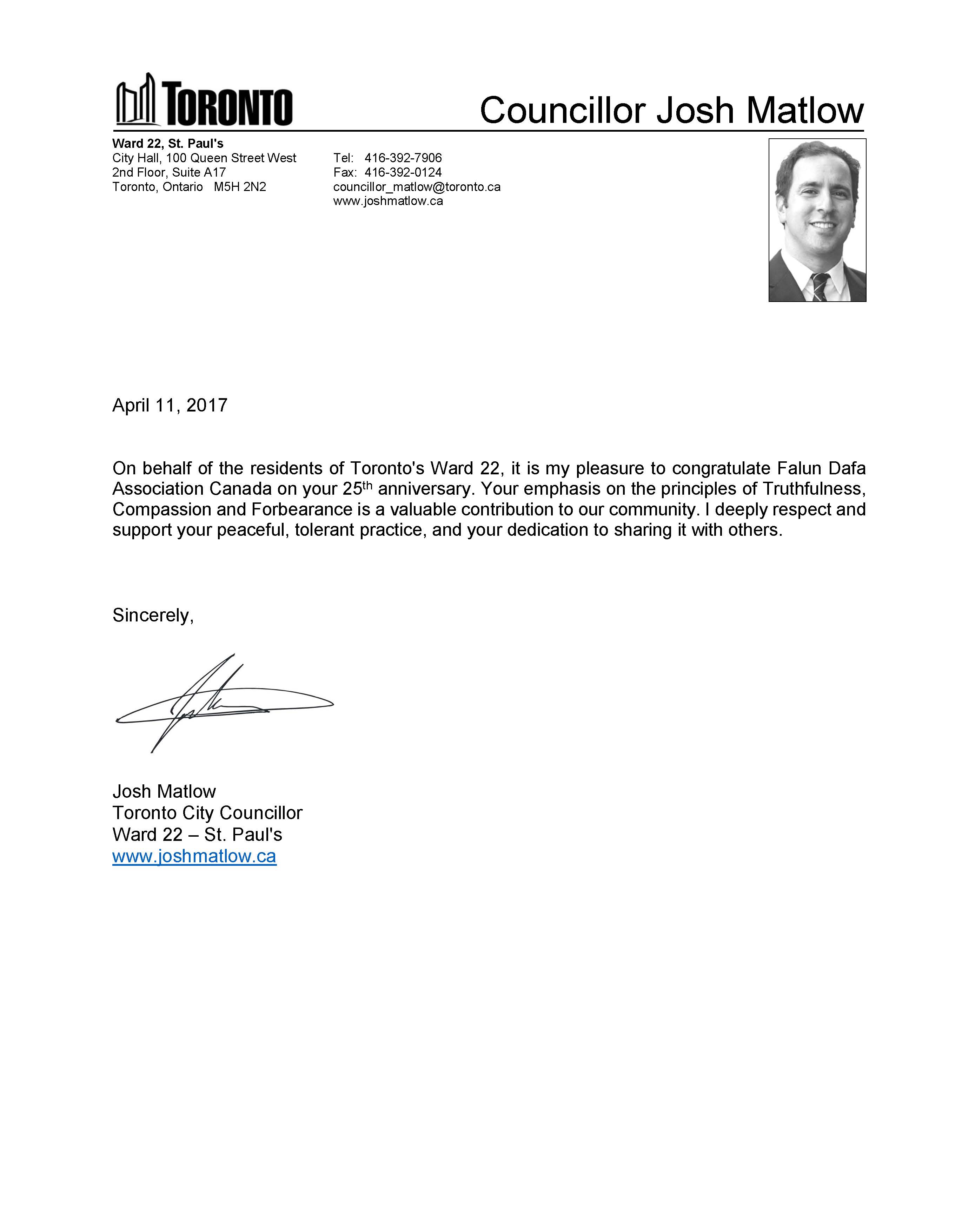 ![]() 多伦多市议员Josh Matlow贺信 |