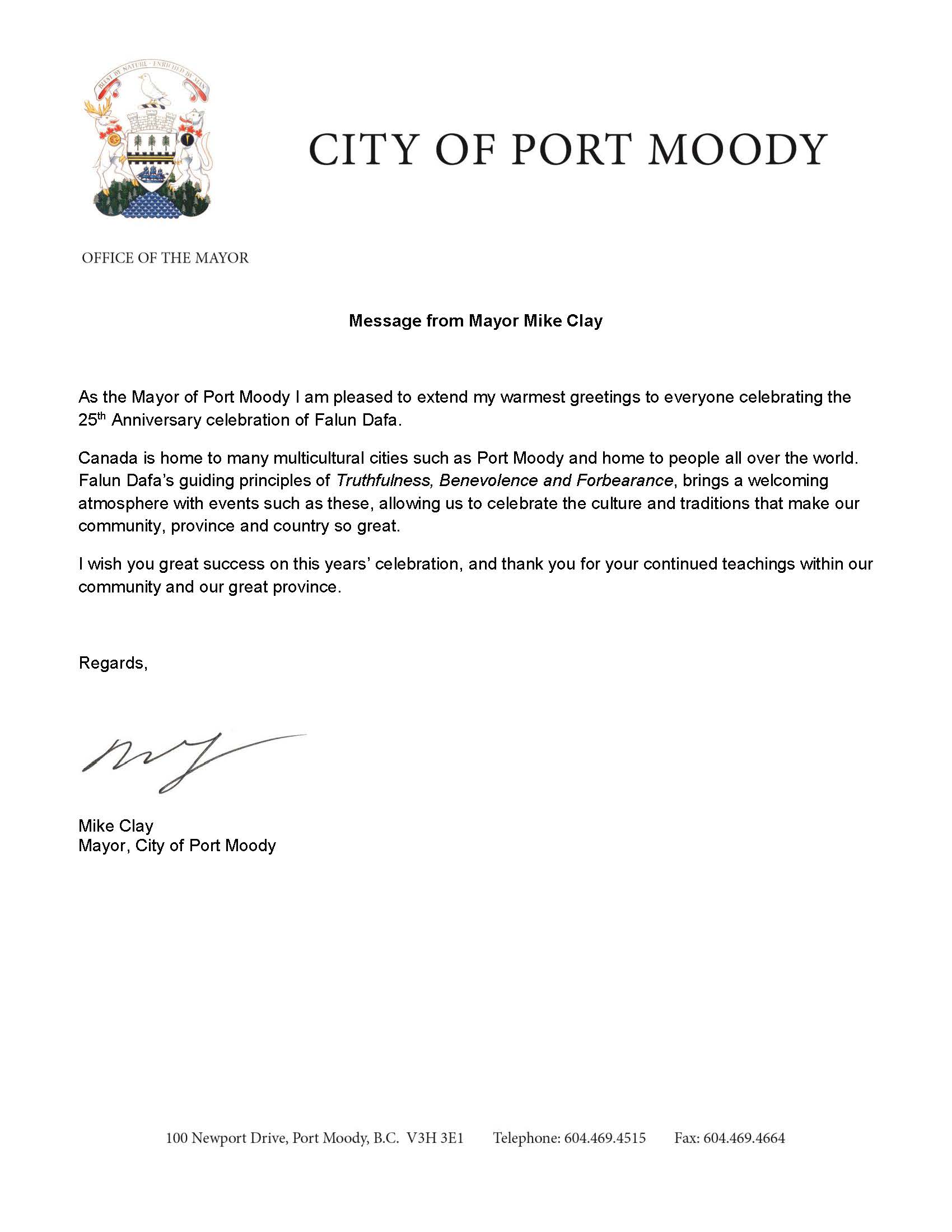 ![]() Port Moody市市长Mike Clay贺信 |