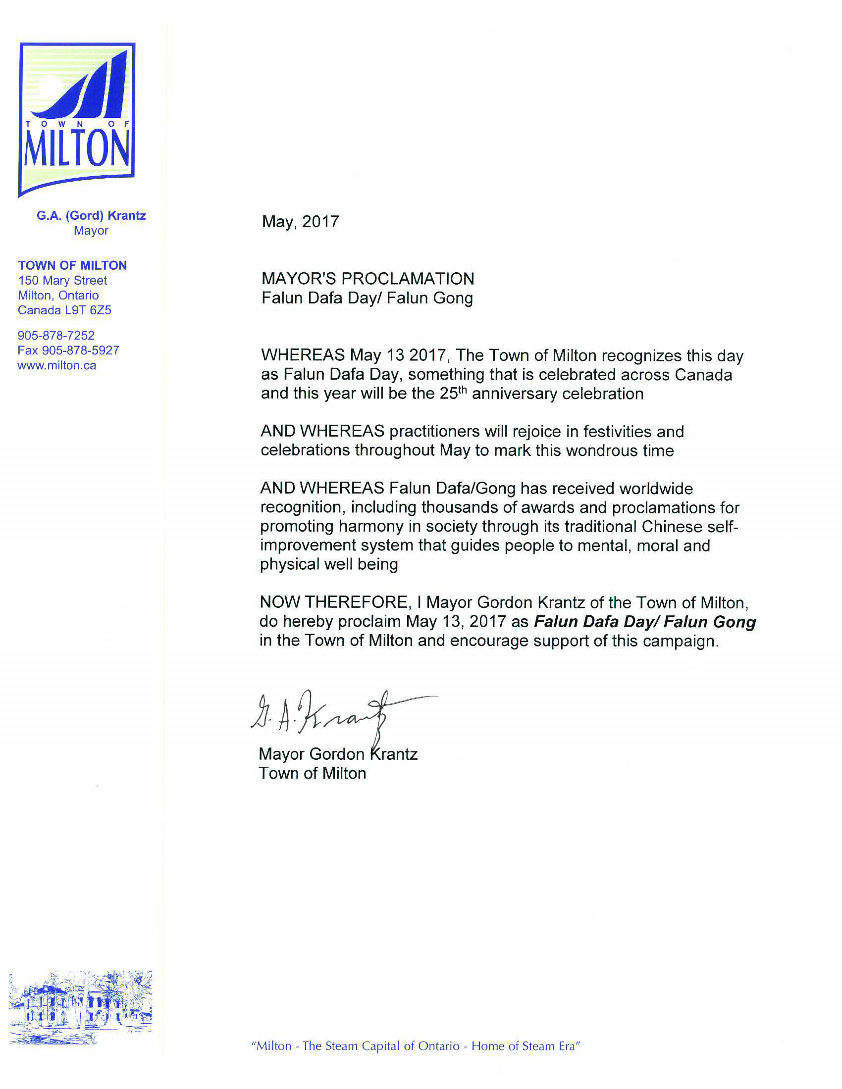 ![]() Miltion市宣布5月13日为法轮大法日褒奖 |