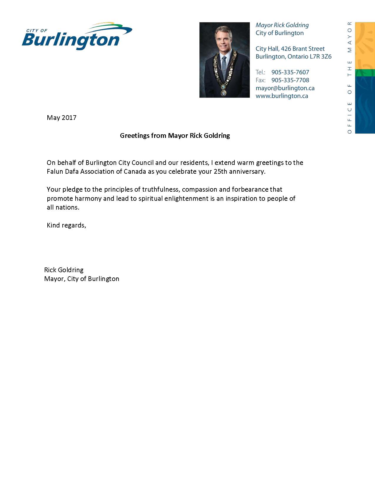 ![]() Burlington市市长Rick Goldring先生贺信 |