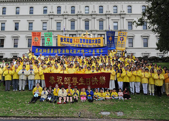 五月六日,在世界法轮大法日前夕,墨尔本法轮功学员以集体炼功的形式,恭祝法轮大法创始人李洪志先生华诞暨大法洪传25周年。