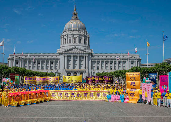 五月六日,旧金山法轮功学员齐聚在市政厅广场,庆祝“世界法轮大法日”,恭祝师尊华诞,与当地民众分享修炼法轮大法的美好和喜悦。