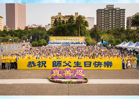 五月七日,台湾北区部份法轮功学员在台北市国父纪念馆前的广场庆祝即将到来的“世界法轮大法日”,恭贺李洪志先生六十六岁华诞。
