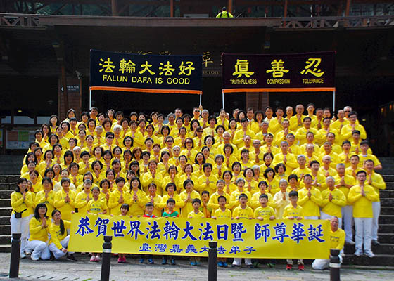 五月七日,台湾嘉义法轮功学员在阿里山上庆祝即将来临的世界法轮大法日,并且给师尊祝寿、谢师恩。