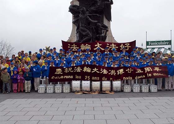 法轮功学员在加拿大魁北克省首府魁北克城举行游行,庆祝法轮大法弘传二十五周年。