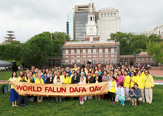 五月六日上午,大费城地区部份法轮功学员在美国《独立宣言》的诞生地–自由钟独立宫的广场草坪举行了庆祝法轮大法日活动。