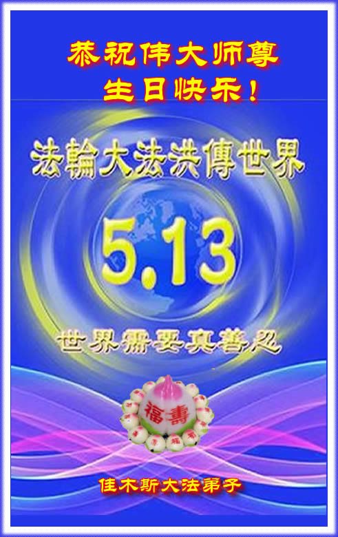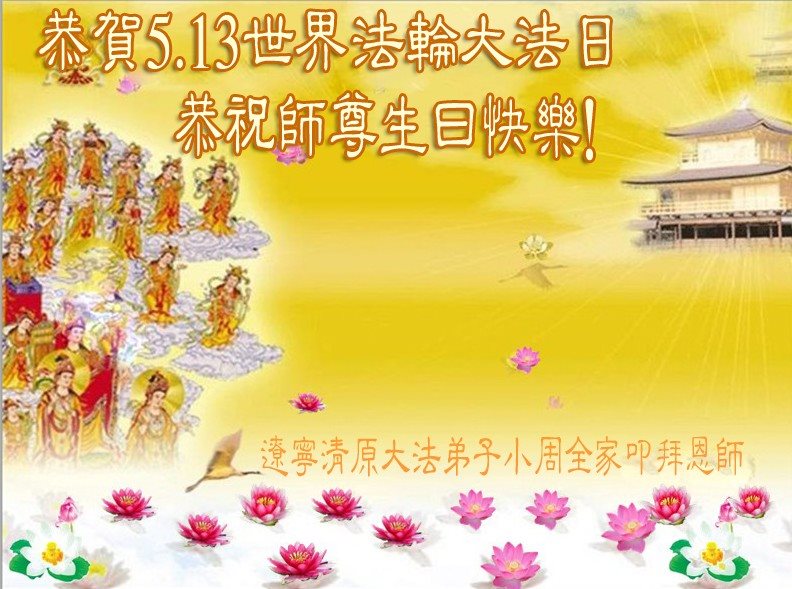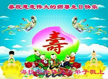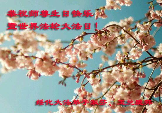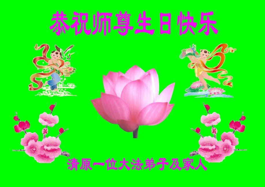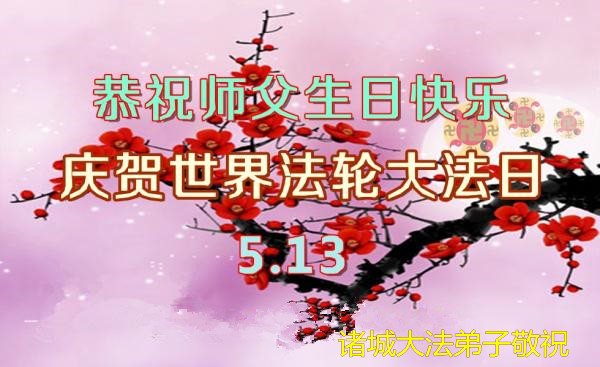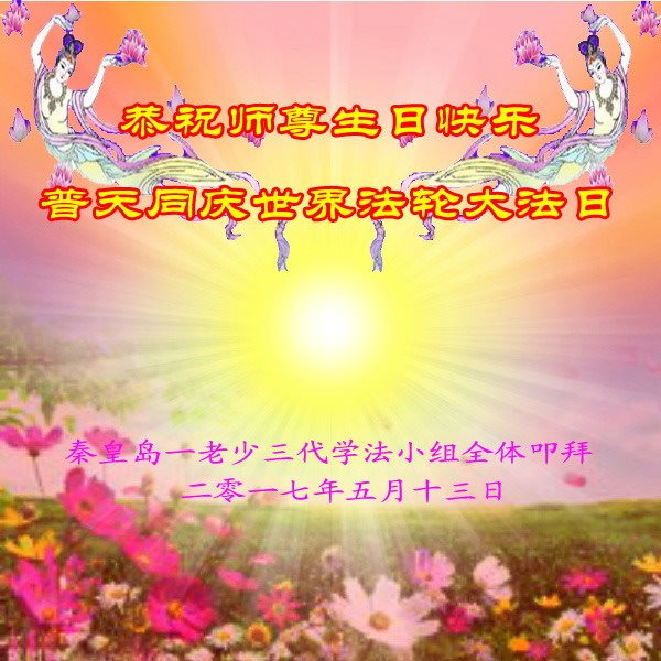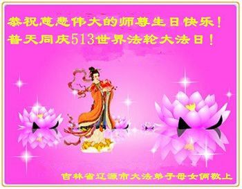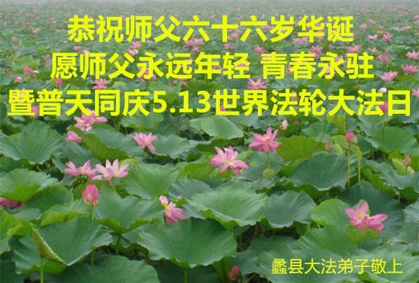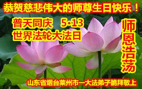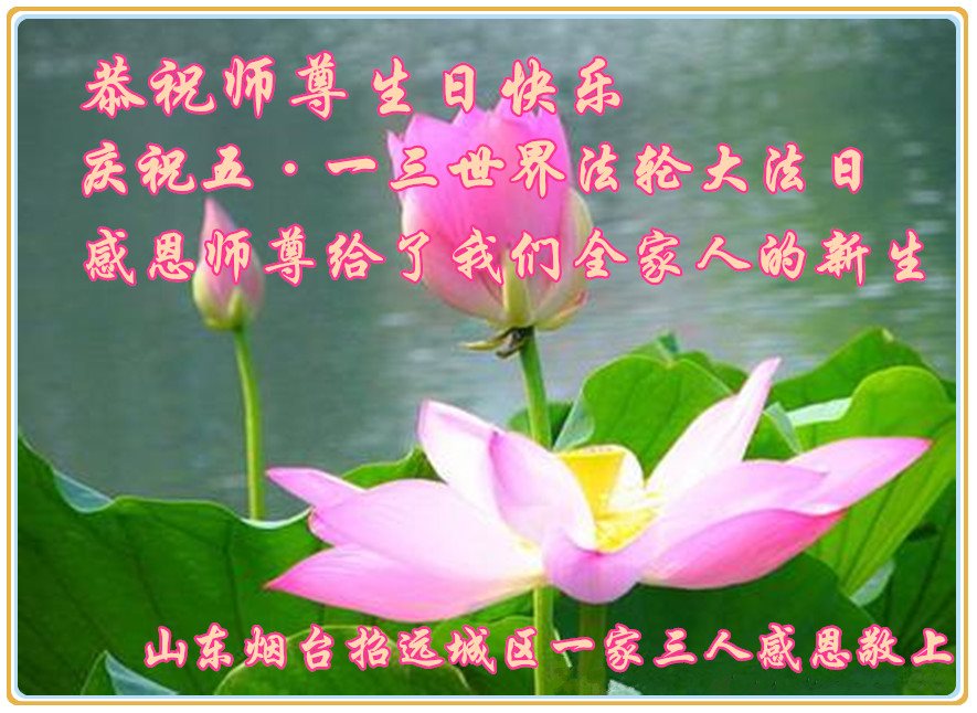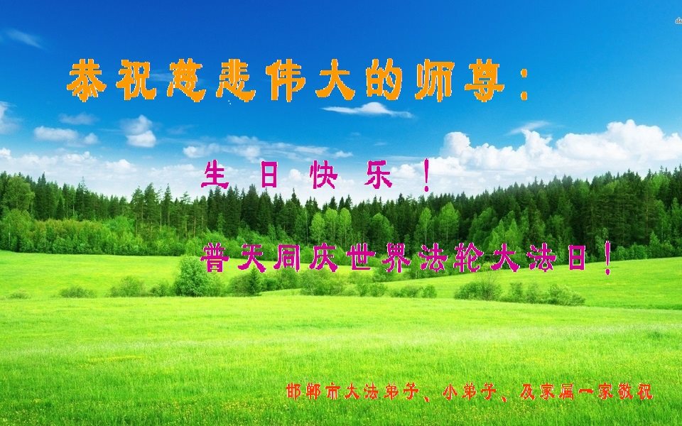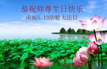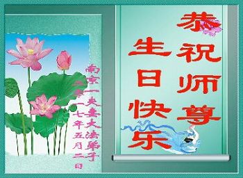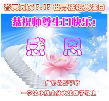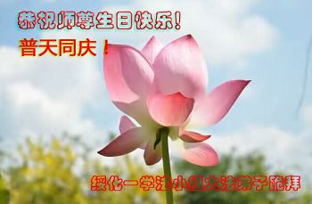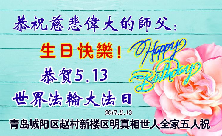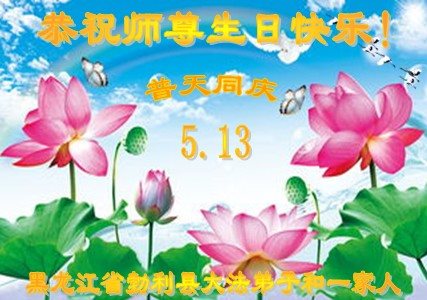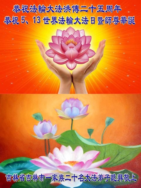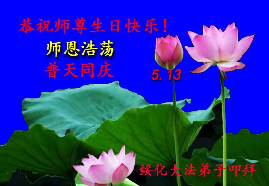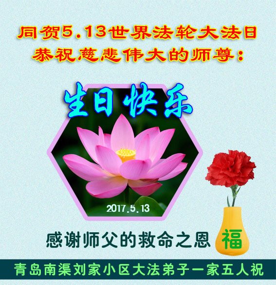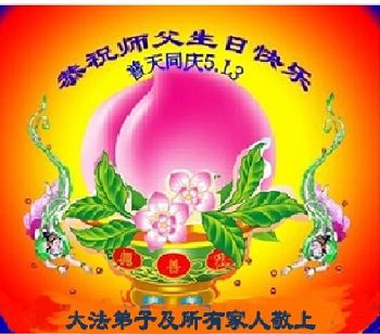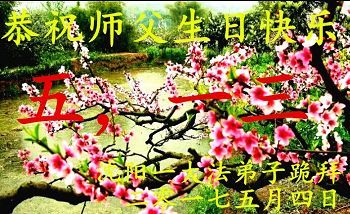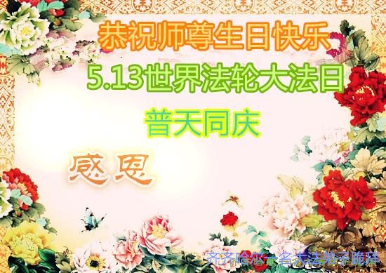 在五一三这个普天同庆队伟大时刻,我和我的家人在此恭祝:恭祝慈悲伟大的师尊生日快乐!为了芸芸众生得救,师父,您辛苦了!在此也祝贺:法轮大法洪传二十五周年!