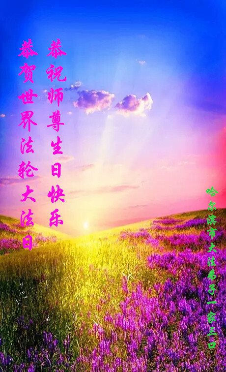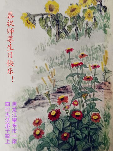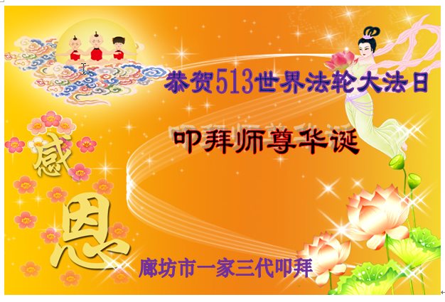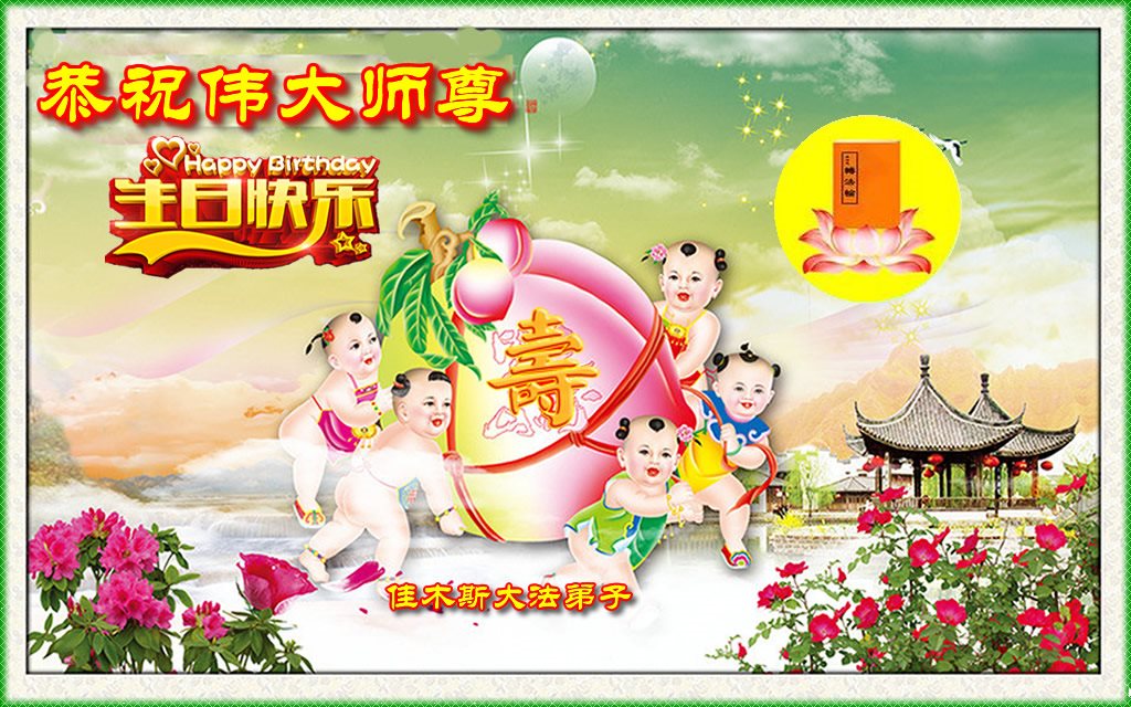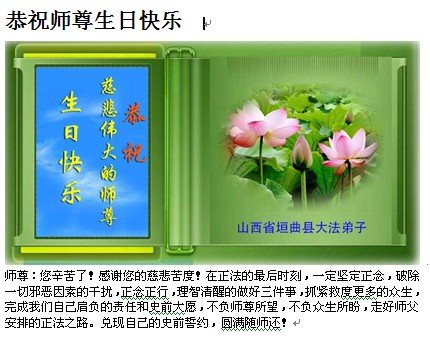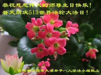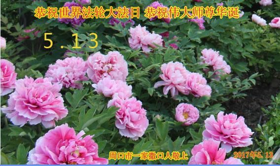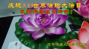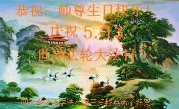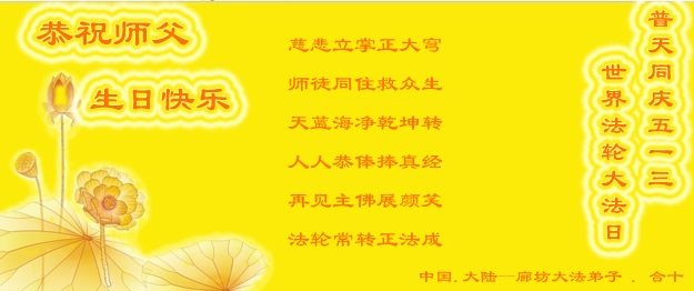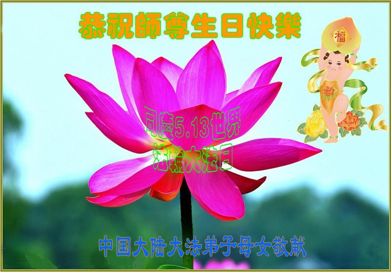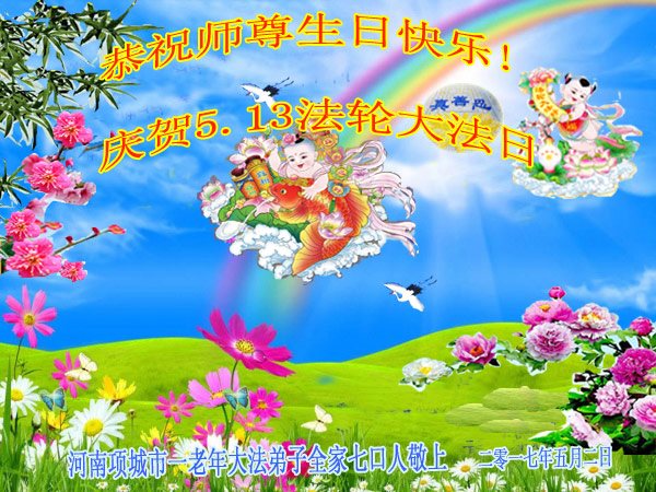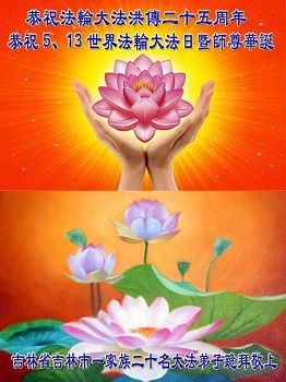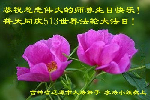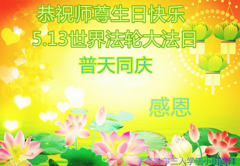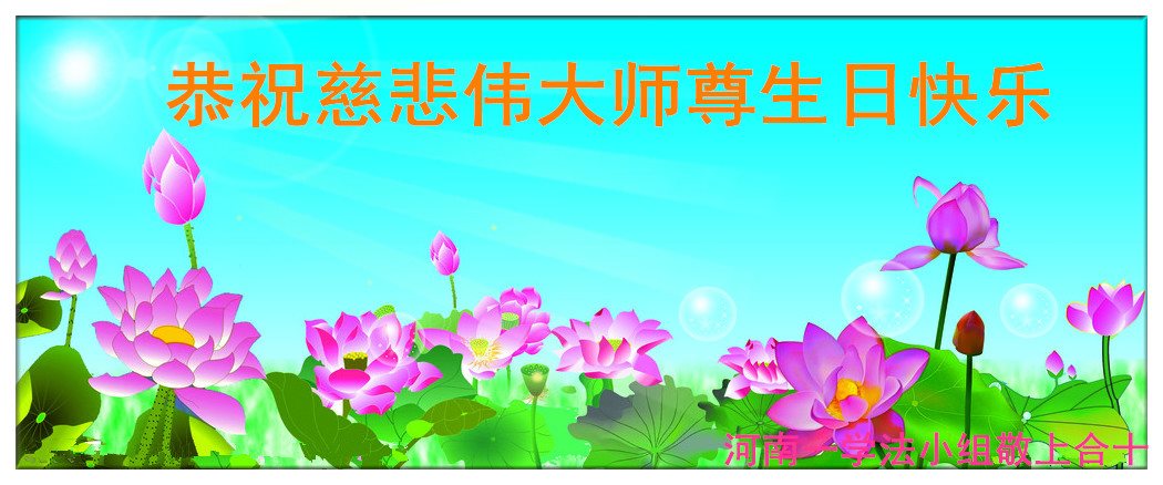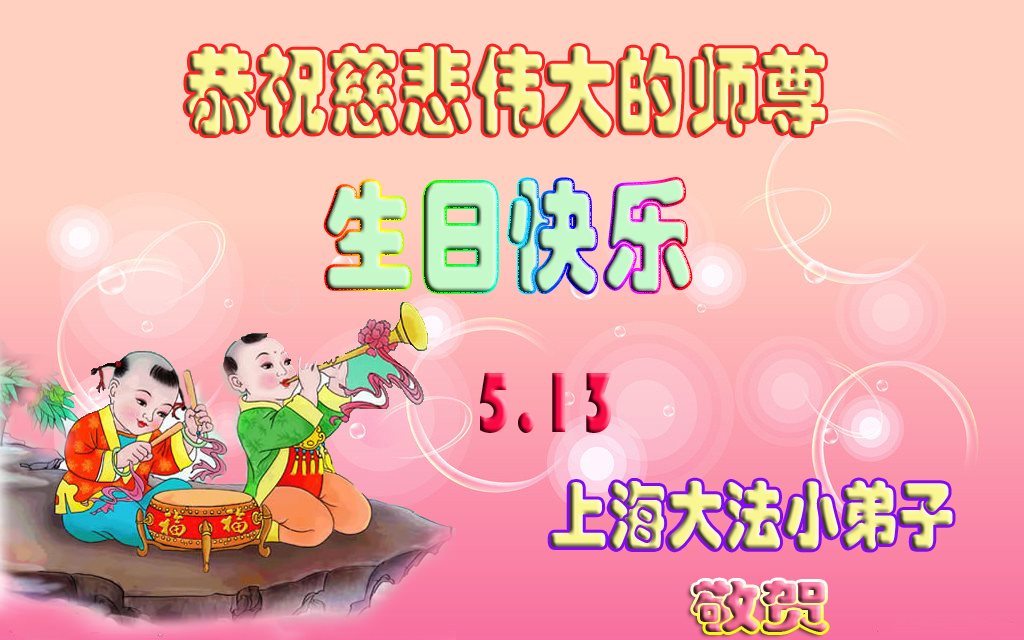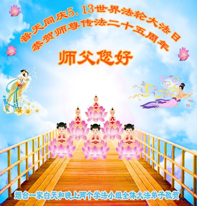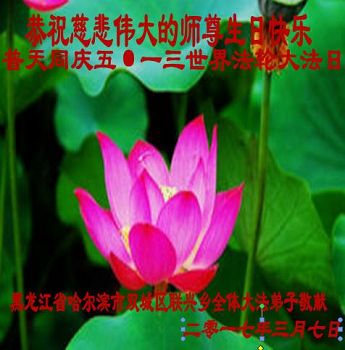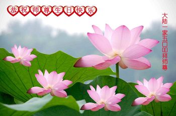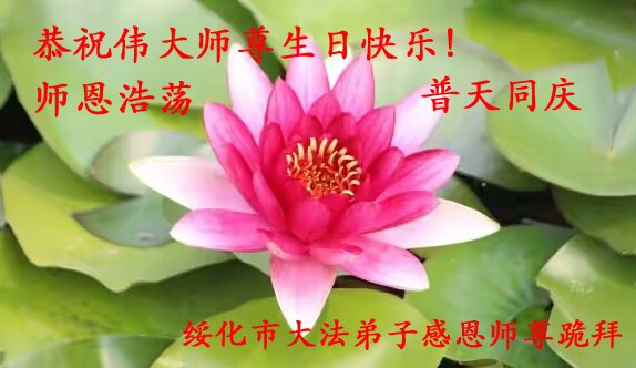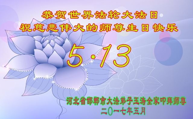在五一三这个普天同庆队伟大时刻,我和我的家人在此恭祝:恭祝慈悲伟大的师尊生日快乐!为了芸芸众生得救,师父,您辛苦了!在此也祝贺:法轮大法洪传二十五周年!