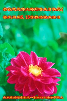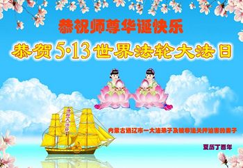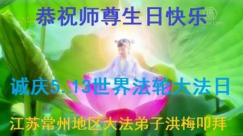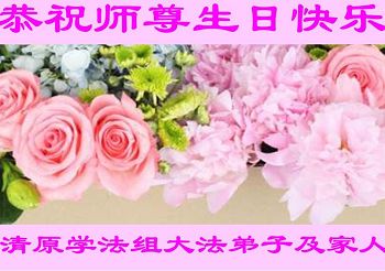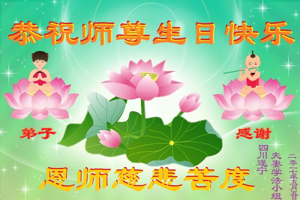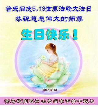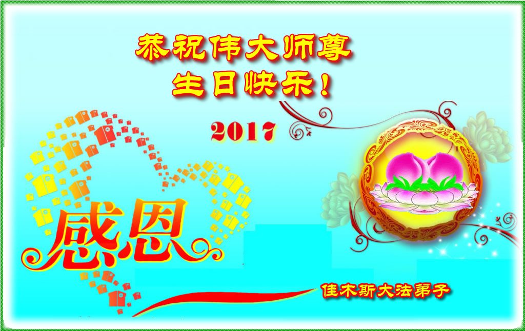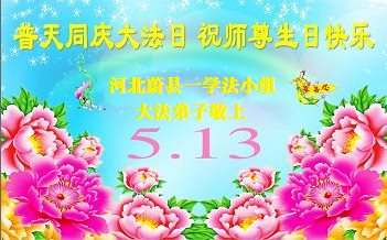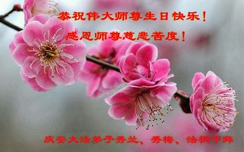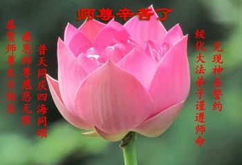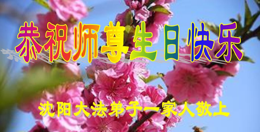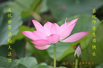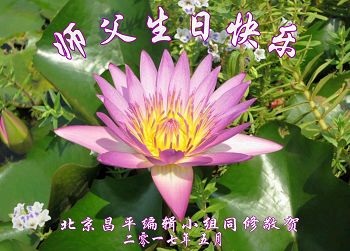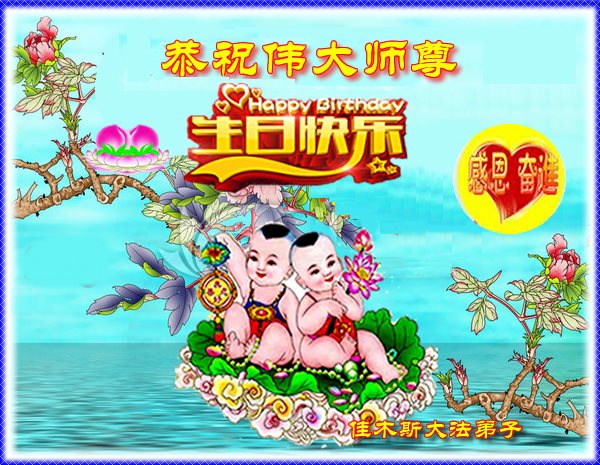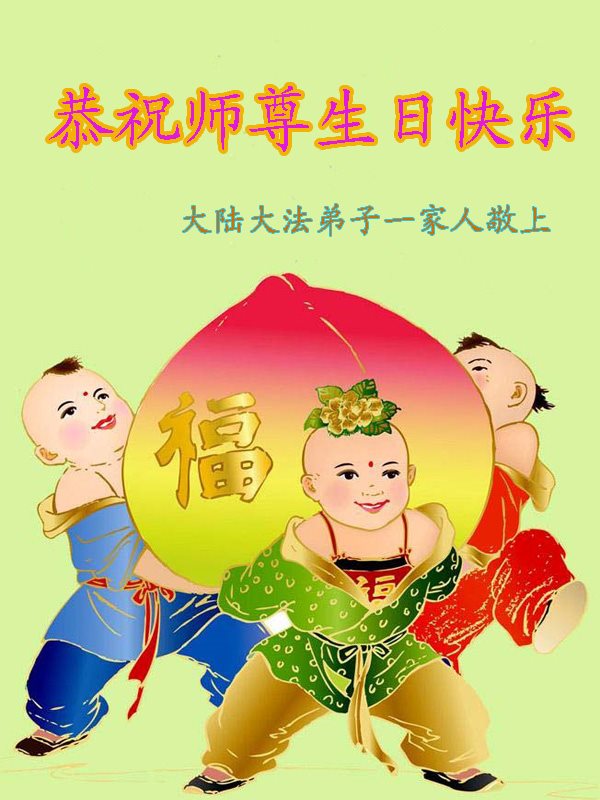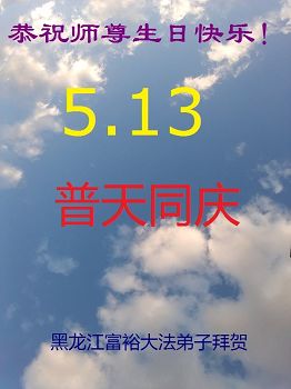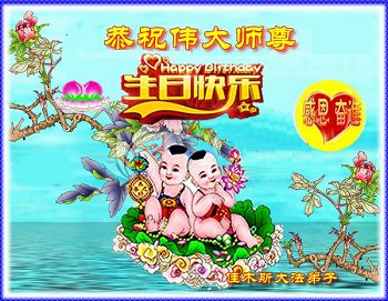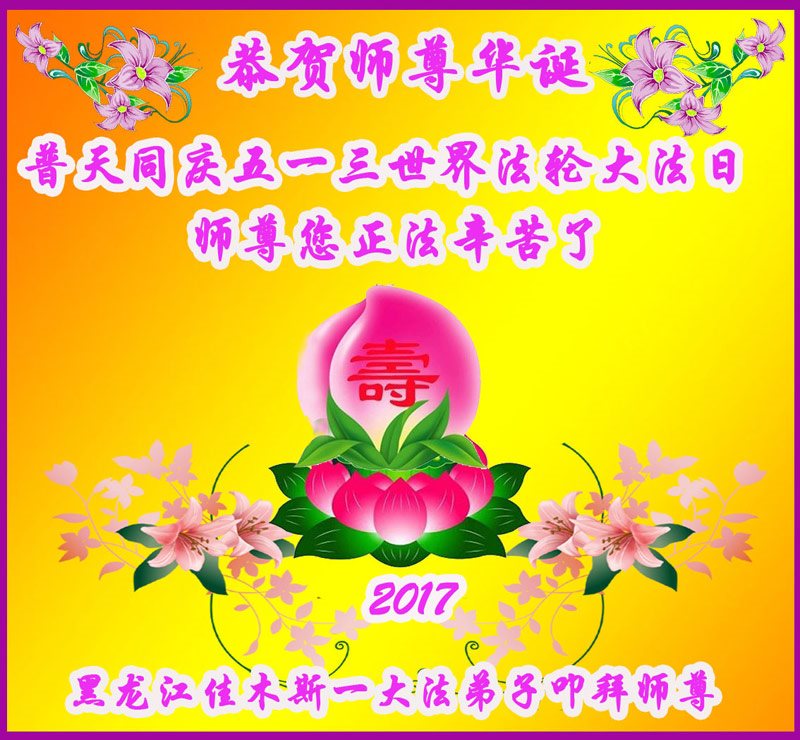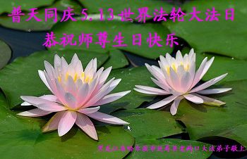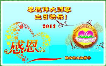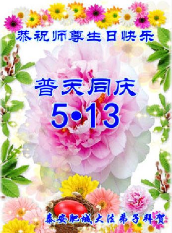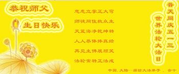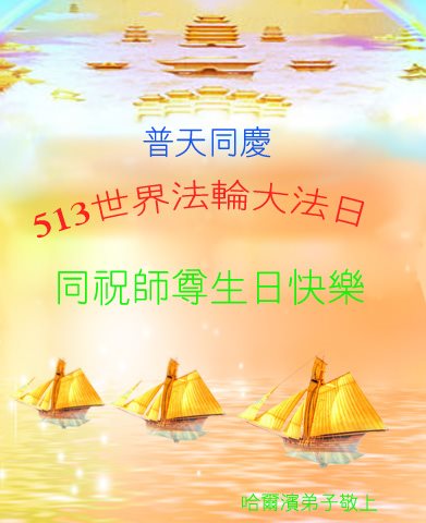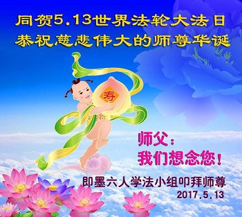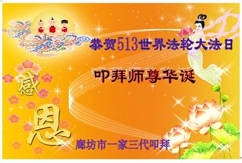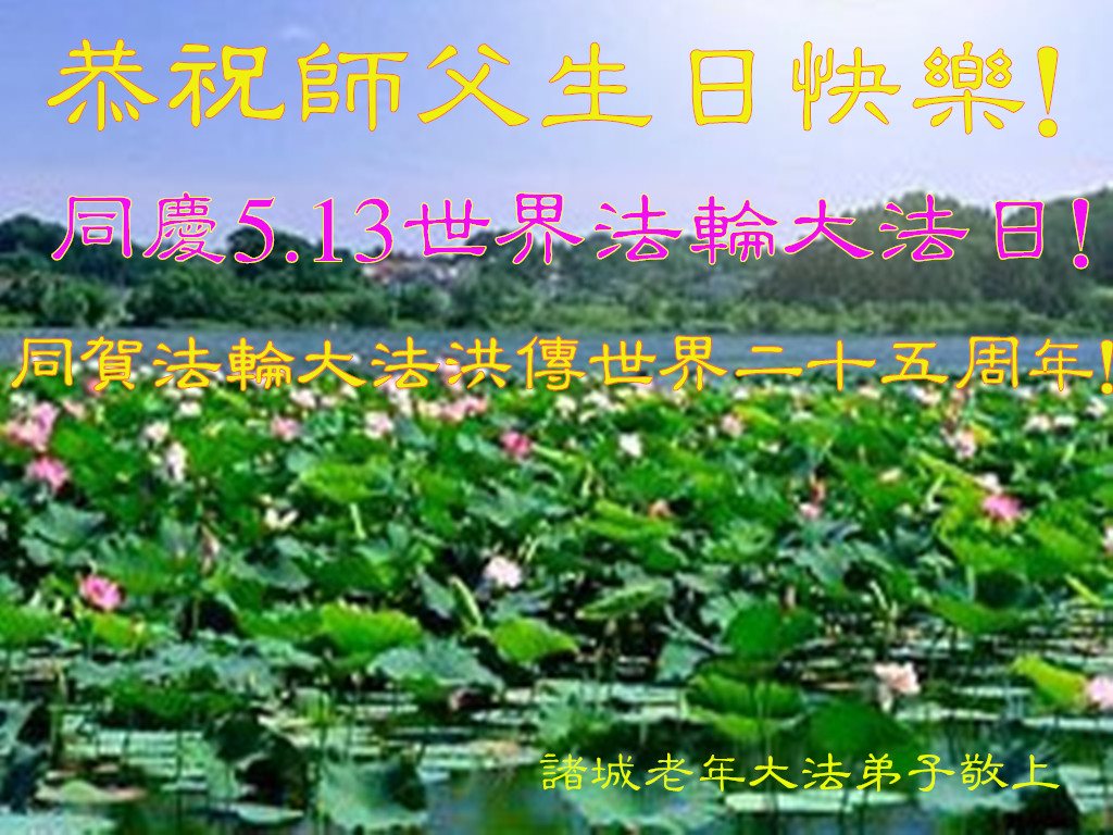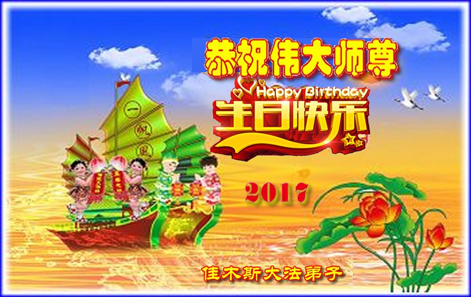 在五一三这个普天同庆队伟大时刻,我和我的家人在此恭祝:恭祝慈悲伟大的师尊生日快乐!为了芸芸众生得救,师父,您辛苦了!在此也祝贺:法轮大法洪传二十五周年!