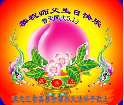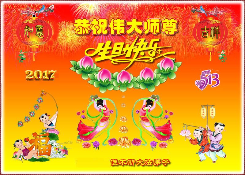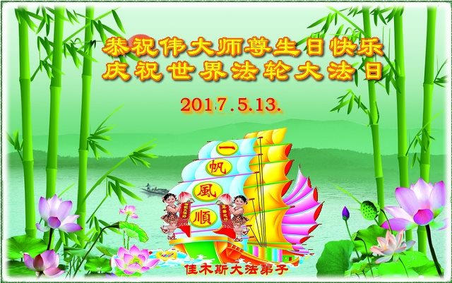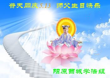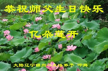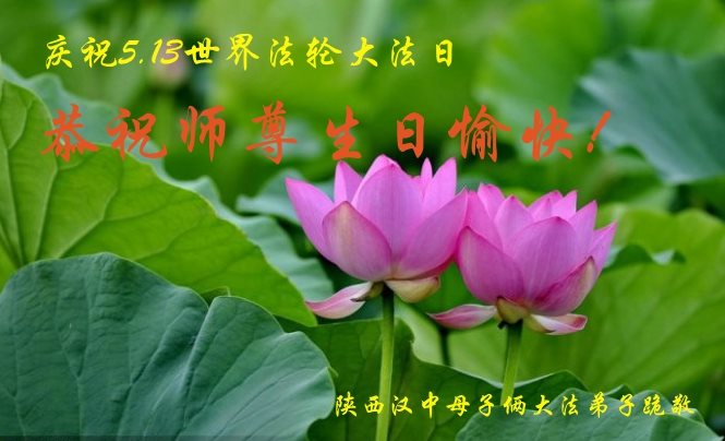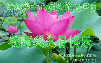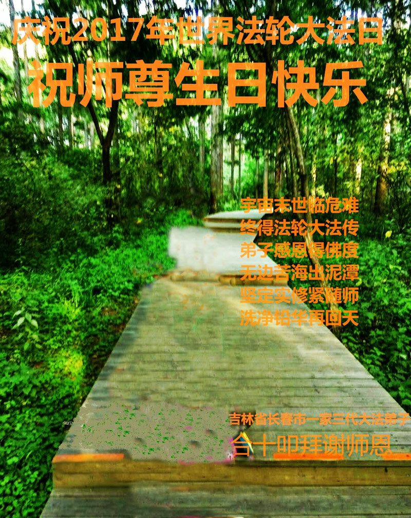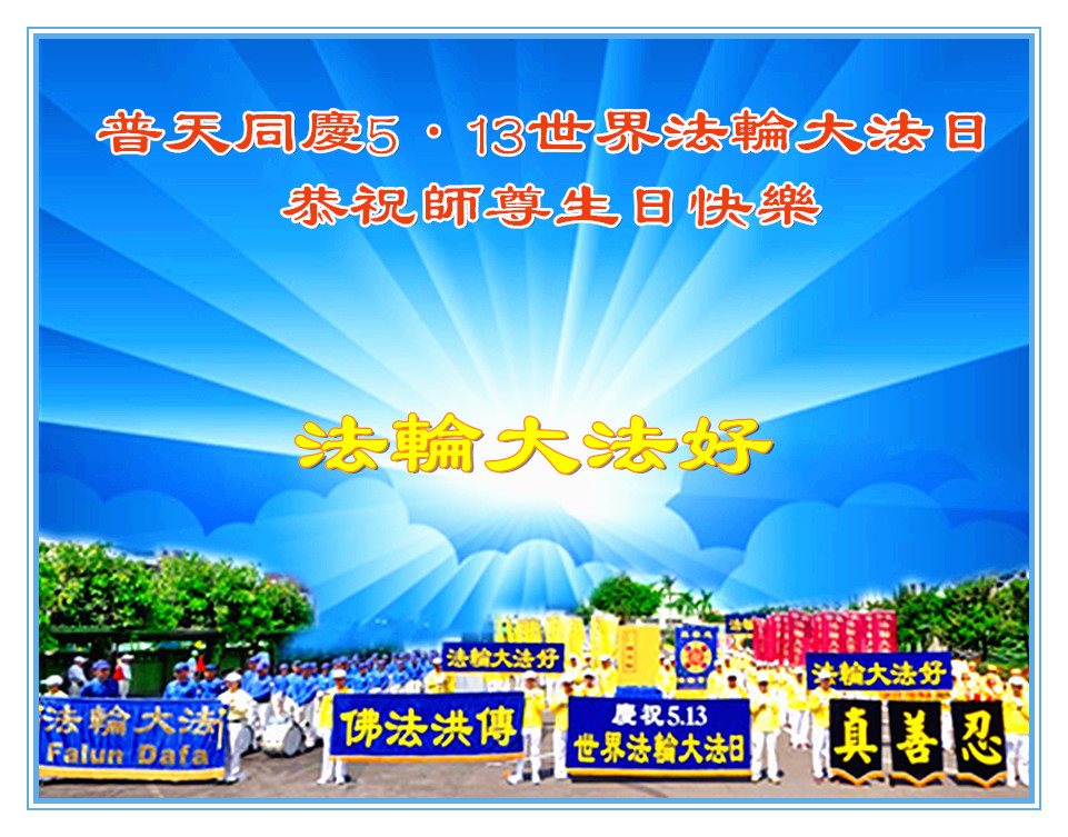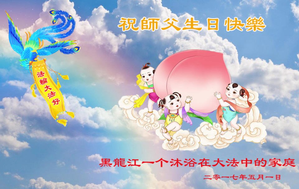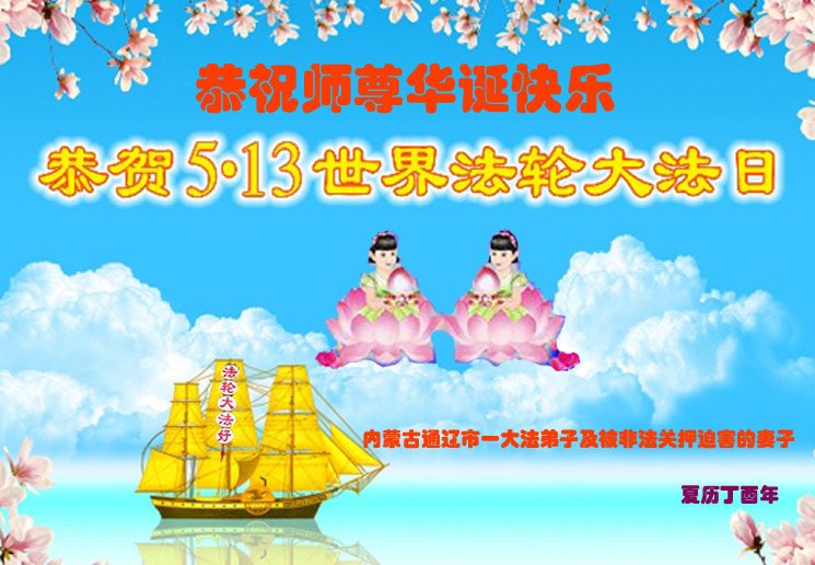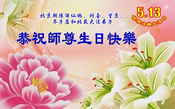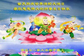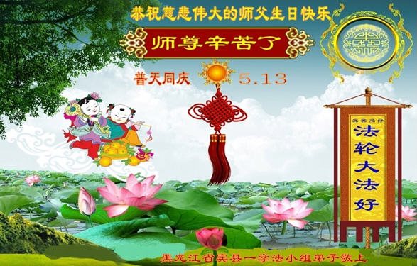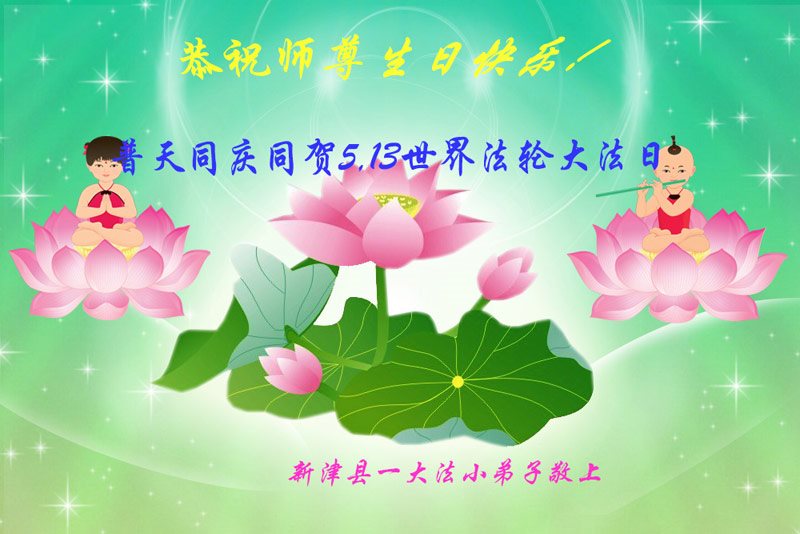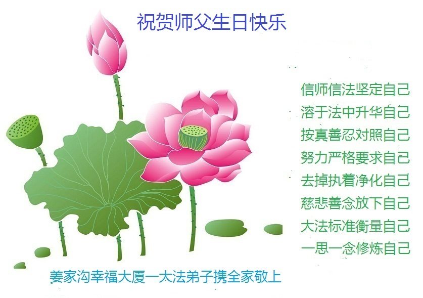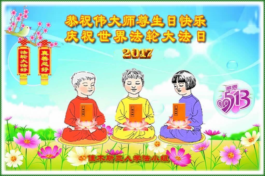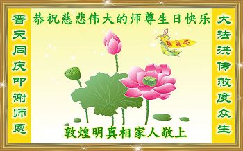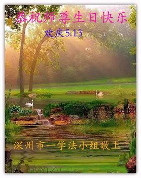 在五一三这个普天同庆队伟大时刻,我和我的家人在此恭祝:恭祝慈悲伟大的师尊生日快乐!为了芸芸众生得救,师父,您辛苦了!在此也祝贺:法轮大法洪传二十五周年!